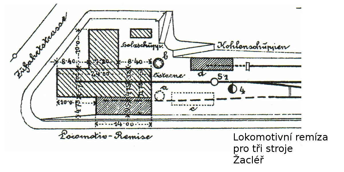 Už jsem to skladiště našel: Stanice Žacléř má dvě koleje sloužící dopravě a jednu skladištní kolej, 1 rampu pro vykládání postranní, jedno skladiště drážní a 1 soukromé, pronajaté firmě W. Reimann v Prkenném Důle. Ve stanici se nachází 1 sněhový pluh, pro který byla v r. 1904 kusá kolej vystavena prodloužením druhé koleje souběžně s širou tratí.