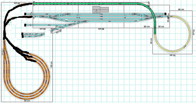 Taky budu řešit layout složený ze dvou smyček. Jedna smyčky hlavní stanice a druhá smyčka skrytá stanice. Tento layout umožňuje jak kroužení souprav ta pendlování souprav mezi virtuálními koncovými stanicemi. Já to mám propojené jednou křižovatkovou výhybkou. Zvolil jsem Baeselerovu výhybku z důvodu větších poloměrů.