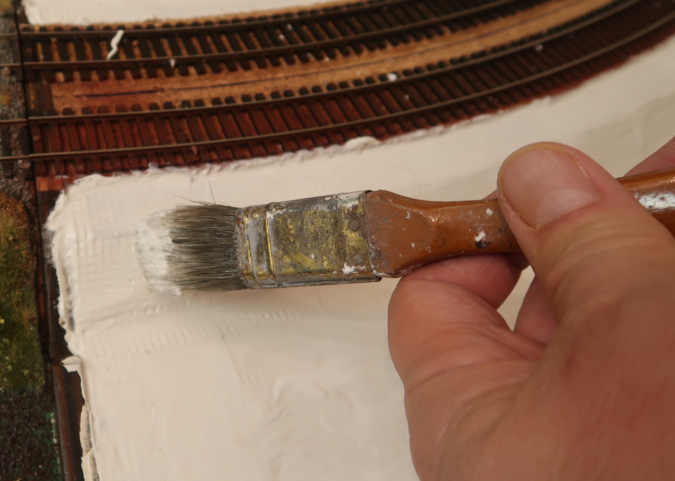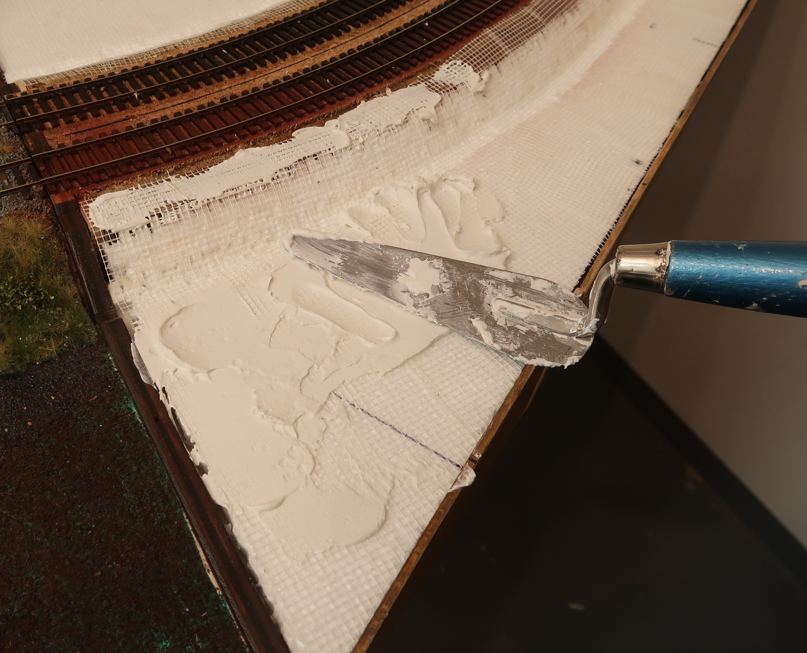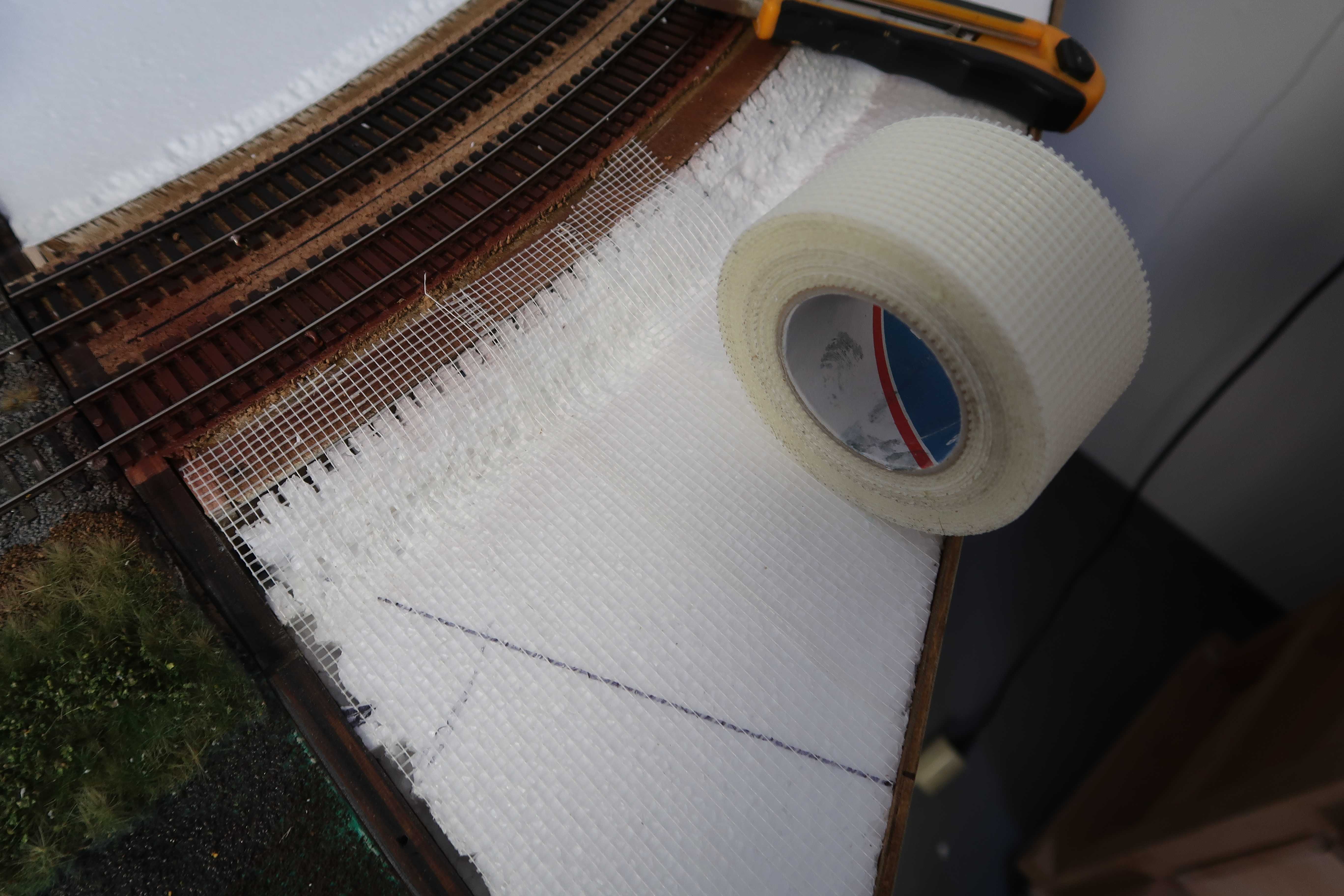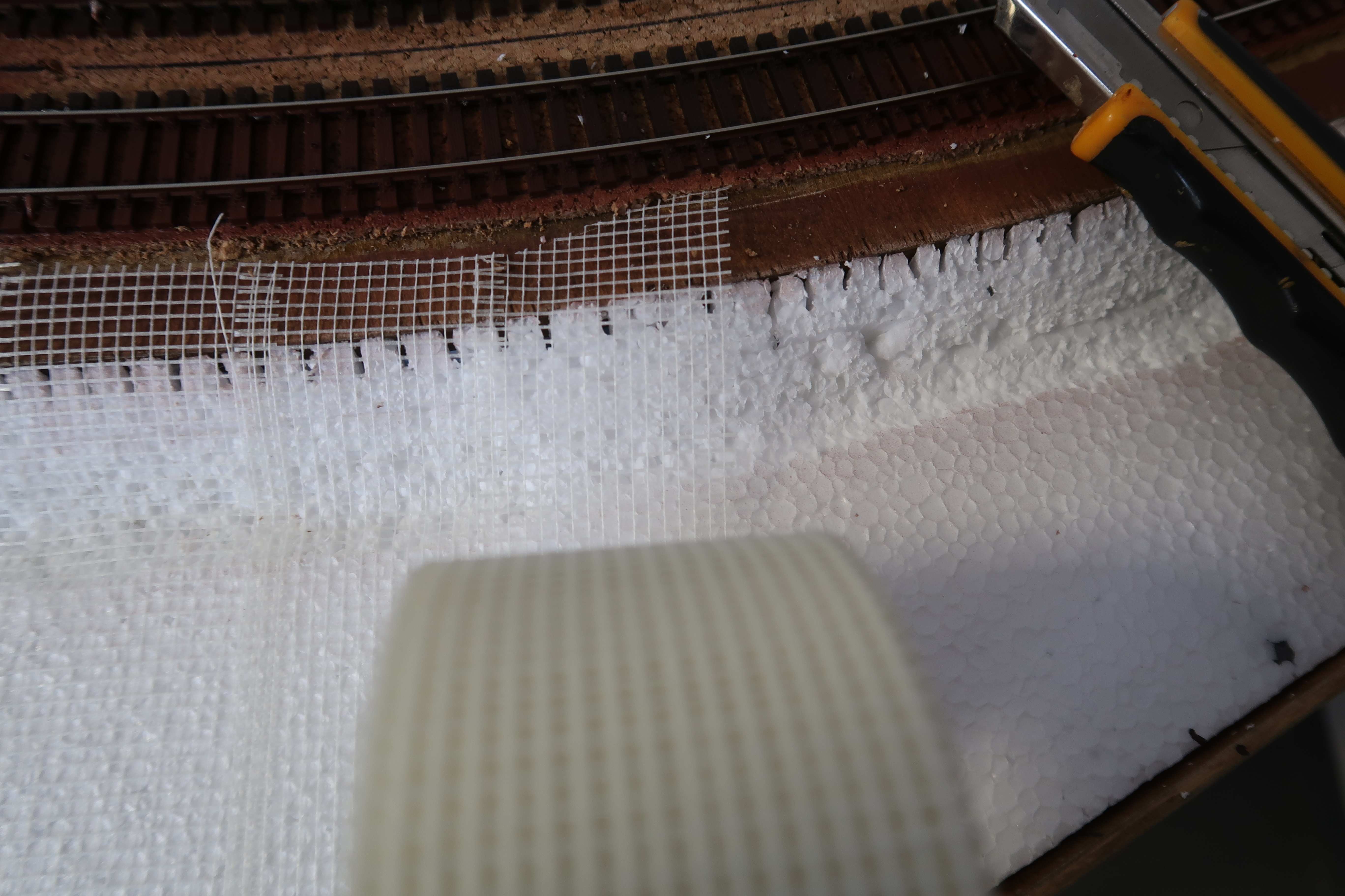 Když dosáhnu ,,rašpli,, požadovaného tvaru a požadovaného budoucího terénu ,nalepím na polystyrén a ostatní materiál (překližka) z pevňovací sádrokartonářskou siťku.Za, x peněz asi v řádě 100kč.na všechny moduly.