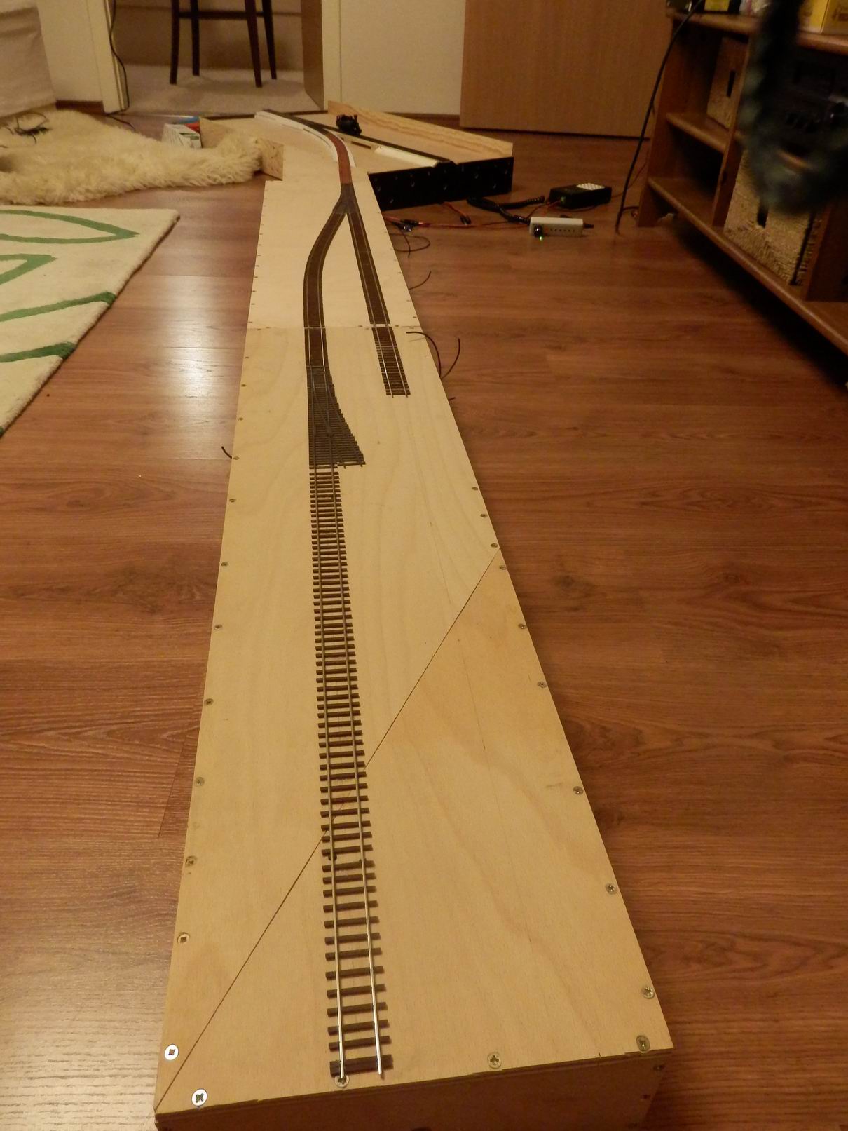 Jedním z požadavků bylo, aby to šlo zbalit do jediné bedny 100x50x50cm. Proto se vlastně jedná o dva moduly 100x50cm, z nichž jeden je podélně rozdělený a tvoří samotnou vlečku. Spojovací díl a díl s kusou kolejí ke kotelně jsou vytvořeny tak, aby se vešly dovnitř konstrukcí těchto modulů.