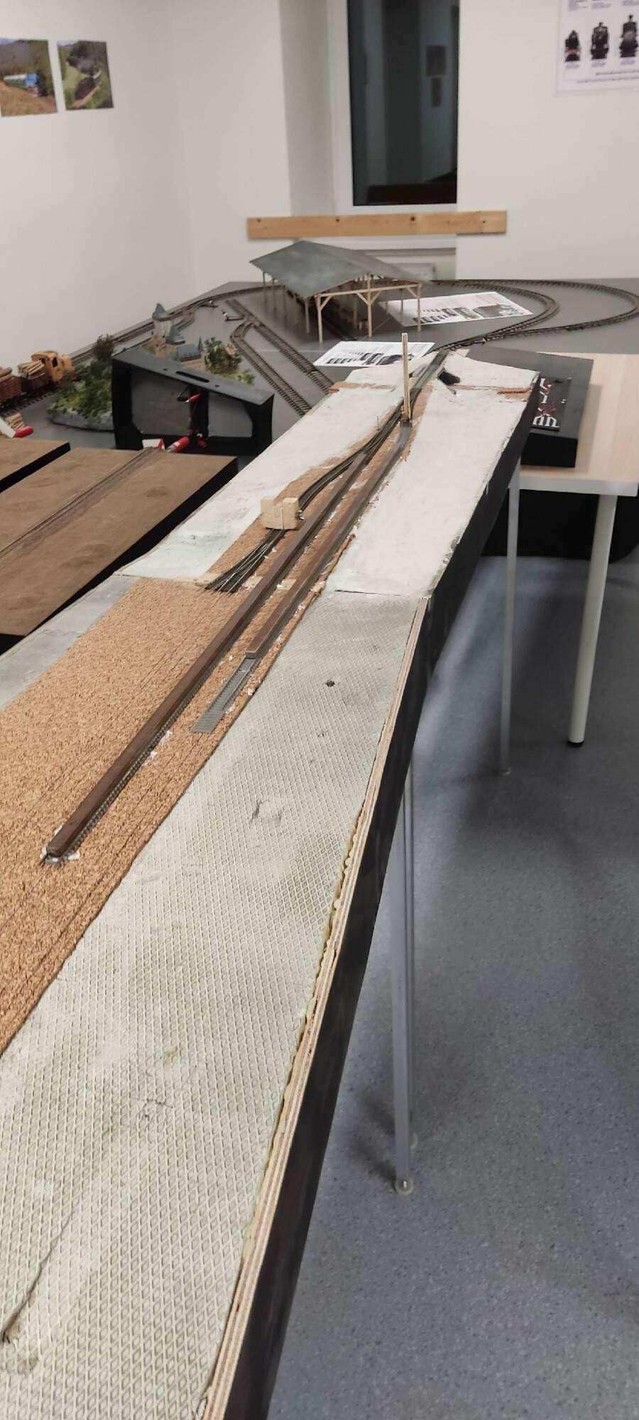 Od posledního příspěvku už je to čtvrt roku jak se dívám, ale na provedených pracích na modulech to není moc znát. V dubnu abych urychlil pokládku, kterou jsem do té doby prováděl pouze v klubu, jsem si některé moduly natáhl i domů, kde jsem ve stísněných prostorech v pokládce pokračoval po večerech. Ještě během dubna a května byly téměř položeny všechny staniční koleje, kromě dvou vekslí na druhém modulu (je vidět vzádu na druhé fotografii) protože dvorní dodavatel zrovna neměl na skladě :D vím chabá výmluva, když se dalo objednat a do pár dní bych měl doma :D Současně v klubu jsem se víc zabředl do drátování na čelčickém zhlaví.