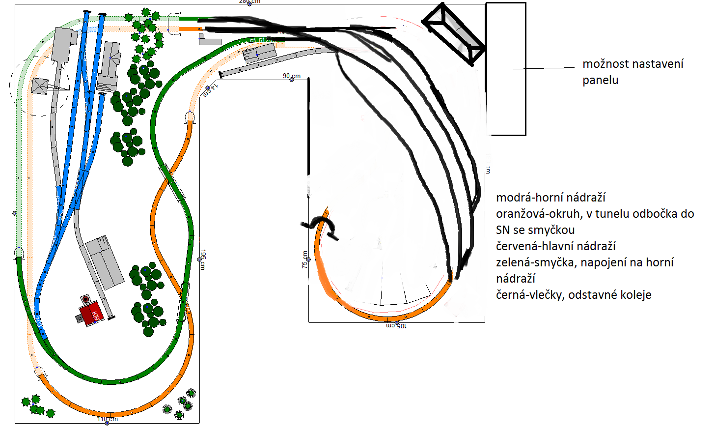 V plánku chybí ještě SN se smyčkou, vjezd do SN je z oranžové koleje v tunelu. Celé je na levém panelu