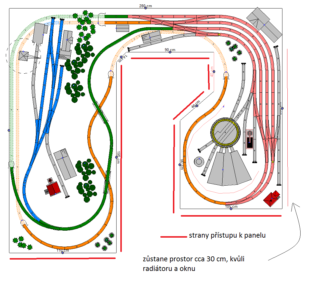 RadekH0 píše:A co kdybys ten výřez v panelu srovnal a celou stanicí dal do úhlopříčky? Poloměr bys měl možná i 1000mm a délka kolejí by byla možná skoro dvojnásobná. Navíc by to bylo víc u kraje panelu, takže jako bonus lepší udržba. Jsen tak jsem to načrtnul, musíš se podívat jak by to vyšlo v programu.Radek