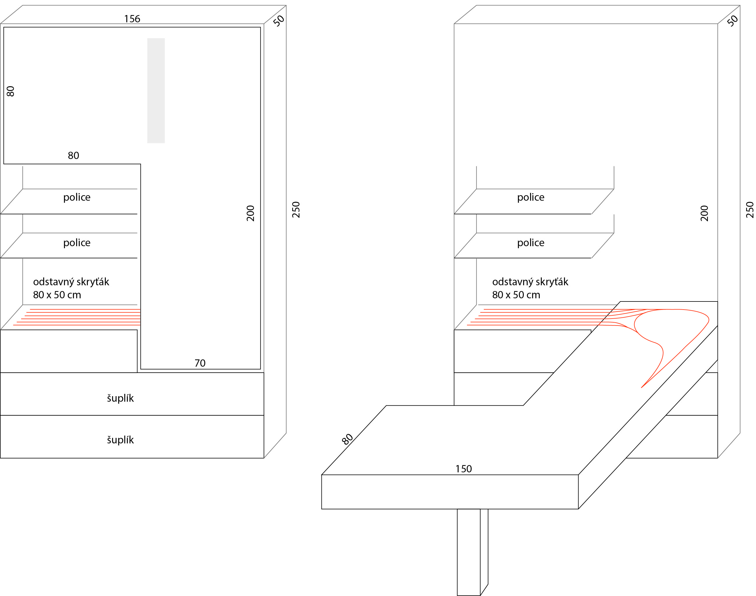 Tak je potencionální problém do budoucna, neboť kolejiště se staví docela dlouho, je z toho bordel, a dlouhodobý pohled na staveniště přímo v obýváku vydrží málokterá... :wink: Ideální je tedy možnost to kolejiště schovat. Aby mohla přijít návštěva, aby pár dní nebyl bordel vidět, uklidit na svátky, atd. Třeba by ti truhlář mohl spíchnout takovouhle krásnou skříň, kterou jsem ti navrhnul - kolejiště bys vyklopil a na kolejnicích dorazil...ale asi je vše jasné dle obrázku :wink: