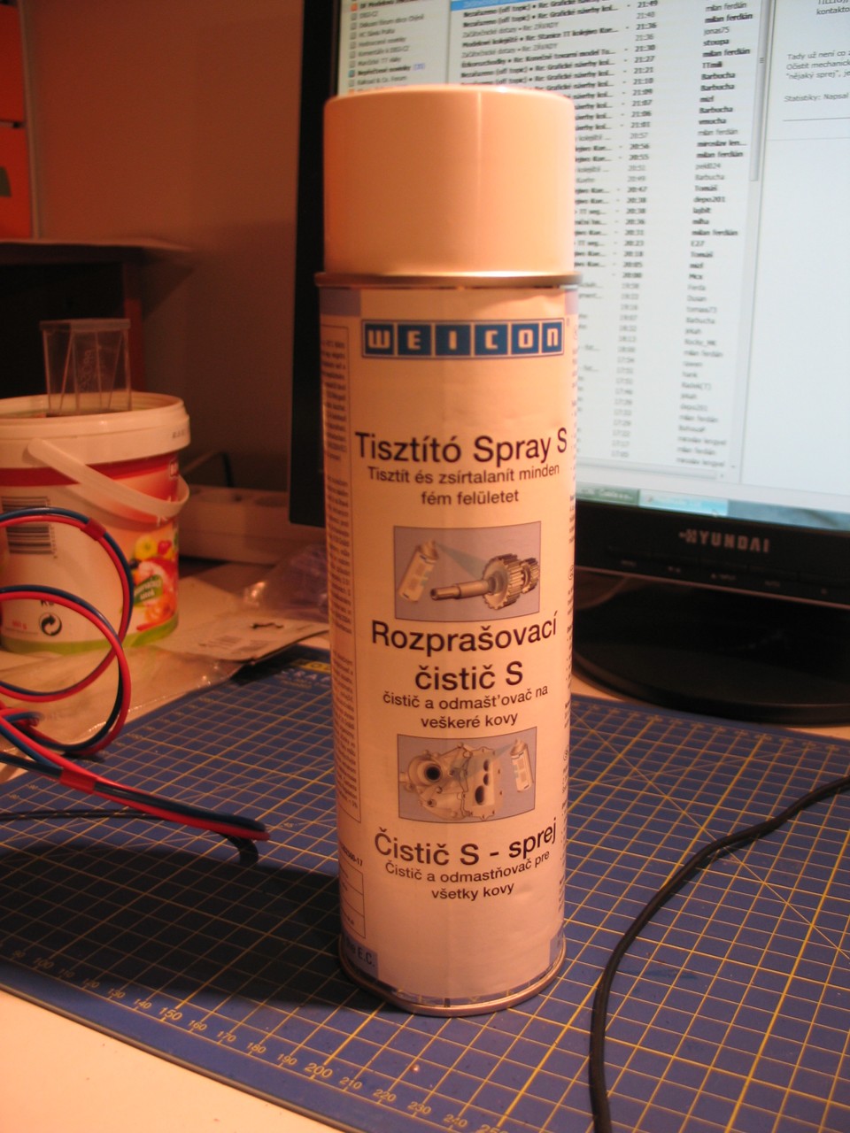 Jako nejlepší čistidlo se mi zatím projevil "Čistič S" od firmy Weicon. Je to čistič s odmašťovačem na všechny kovy. Používá se třeba k čištění motorů apod. Já používám verzi ve spreji.