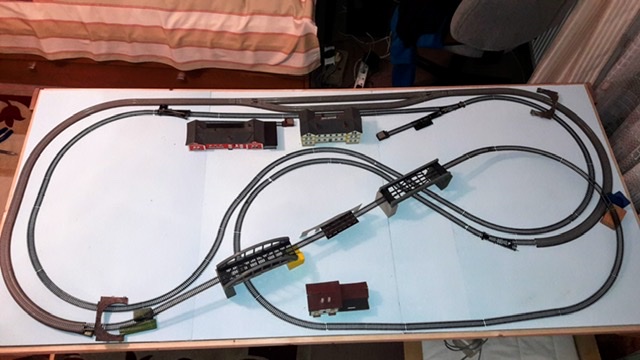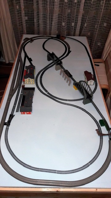 Navrhl jsem si kolejiště pro syna 200x90 viz foto - v tuto chvíli je z části z kolejiva s podložím a částečně BTTB koleji (analog) - dvě nezávisle smyčky pro dvě trafa, zatím bez možného přejezdu mezi okruhy