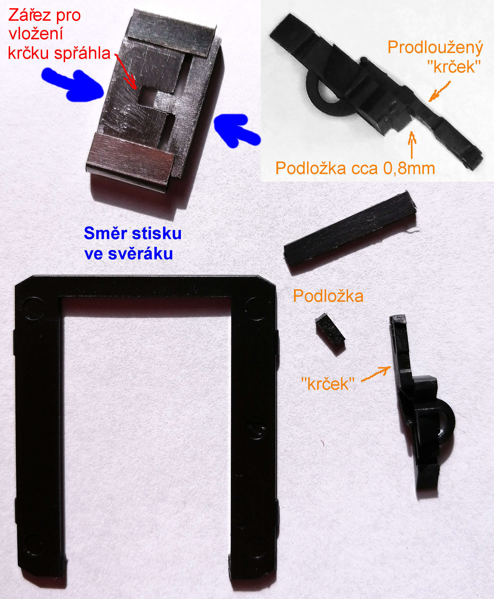 a vybrousil jsem z kousku železe dvoudílný "lisovací" nástroj, který po vložení spřáhla právě těmi prolisy do výřezu v přípravku umožní ve svěráku stisknout "krček" spřáhla, o něco ho zploštit a dosáhnout tím prodloužení toho krčku ( v mém případě o cca 0,6mm), aniž by tím došlo k nějakému výraznějšímu snížení tuhosti spřáhla. Zjistil jsem, že k zajištění dostatečné vzdálenosti vozidel i v protiobloucích stačí prodloužení spřáhla na lokomotivě o 0,8mm. Použil jsem vnitřní část dia rámečku a vytvořil podložky ( viz foto). Stačí jen prostý malý obdélníček, který jde kupodivu dobře přilepit ke spřáhlu vteřinovým lepidlem. Přišlo mi zbytečné vyrábět obdélník s otvorem uprostřed, protože i spřáhlo bez úpravy se opírá o kraj šachty jen na jedné ( spodní straně). Jak jste si asi všimli, mezi tloušťkou "podložky" (distance) 0,8mm a prodloužením krčku spřáhla 0,6mm je určitá disproporce. Možná by šlo krček spřáhla ještě víc zmáčknout a tím ho víc prodloužit, ale z důvodu zachování té tuhosti a pevnosti v tahu jsem už raději zvolil o něco pracnější variantu- zbroušení zobáčků na konci spřáhla o ty cca 2 desetiny. Výroba přípravku a práce na 1. zkušebním spřáhle mi zabrala cca 3hodiny, ale "sériová" úprava už je práce tak max. na 20minut/ks ....