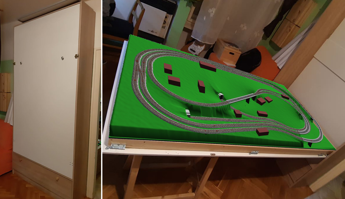 Po 25 letech rezavění jsem synkovi, kterého ve 3 letech vláčky dost chytly, zrekonstruoval moje staré kolejiště. Je to jen malý TT vláčkodrom 120x75cm. Řešil jsem samozřejmě Nerudovskou otázku "kam s ním". Nastálo někde postavené jsem nechtěl/doma neprošlo :) Spouštěné od stropu mi připadalo moc složité a navíc by to moc neřešilo usazování prachu. Někde jsem na webu viděl minikolejiště v kufříku a to mě inspirovalo. Vyřešil jsem to ale trochu větším obalem. V Ikee jsem koupil korpus nějaké skříně a do něj jsem udělal kolejiště vyklápěcí. Jednou za 2-3 dny to vyklopím, mladému tam dám 2 mašinky se dvěma vagónky a už mu to frčí dokola. Zastavuje si už sám na nádraží, rozsvěcí si osvětlení domečků a lampy a je spokojenej :) A je od něj dvě hodiny klid :D