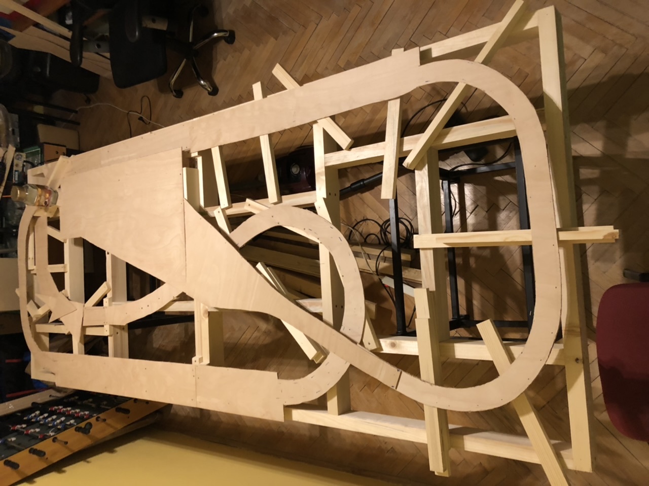Doporučil bych ti nedělat “placatou desku”, ale žebrovaný rám a na něj pokládat podloží pro koleje a teprve do mezer plánovat krajinu a hlavně si nechat prostor pro přístup do skrytých míst… třeba takhle: