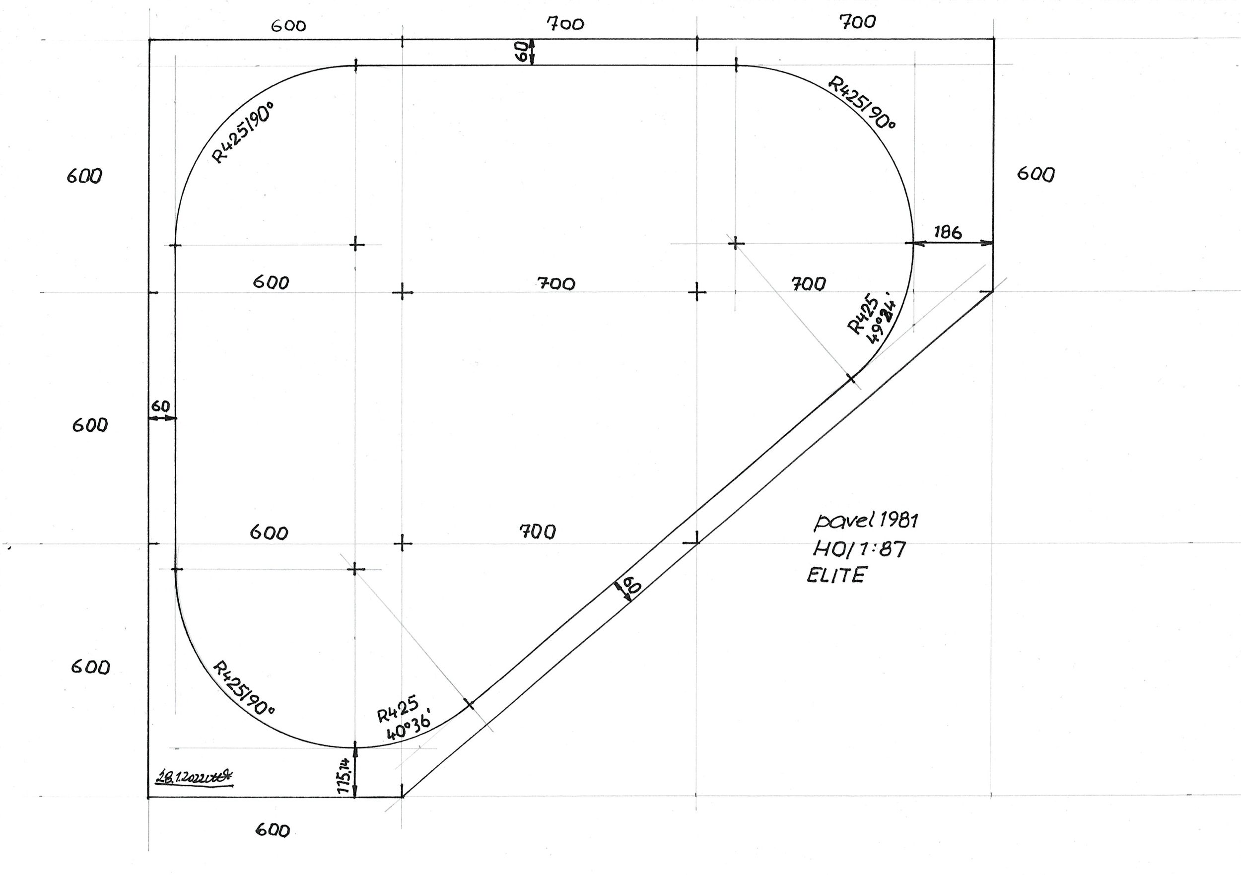 Jasně, já mám málo práce :roll: :D :wink: . Avšak trefil jsi hřebík na hlavičku. Zkusil jsem položit jen jednoduchý ovál. Výsledky nic moc. Upřesním rozměry rastru rámu. Vidíme 600 x 600 a ty obdélníky mají rozměry 700 x 600. Šikmina je vedena pod úhlem 40°36´, což tyto úhly zbožňuji :roll: . Kolejivo ELITE, poloměr oblouku R425. Vypočítal jsem i vzdálenosti od kraje rámu po osu koleje. Vlevo, nahoře a na šikmině vzdálenost 60 mm. Dolní 115,14 mm a napravo 186 mm. Oblouky navazující na šikminu 90°- 40°36´- 49°24´- 90°. To by mě musela múza s manželkou silně políbit :lol: , aby ze mě námět vypadl.