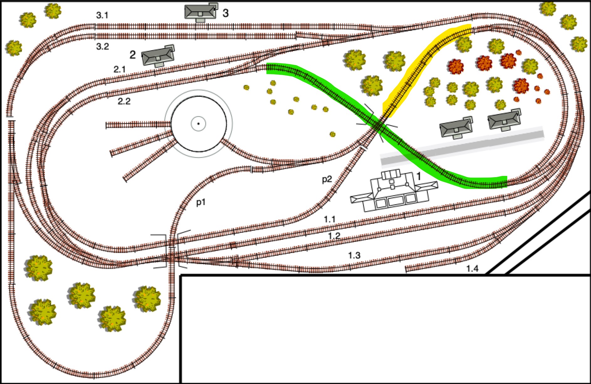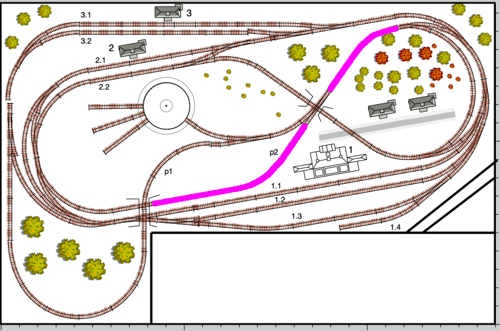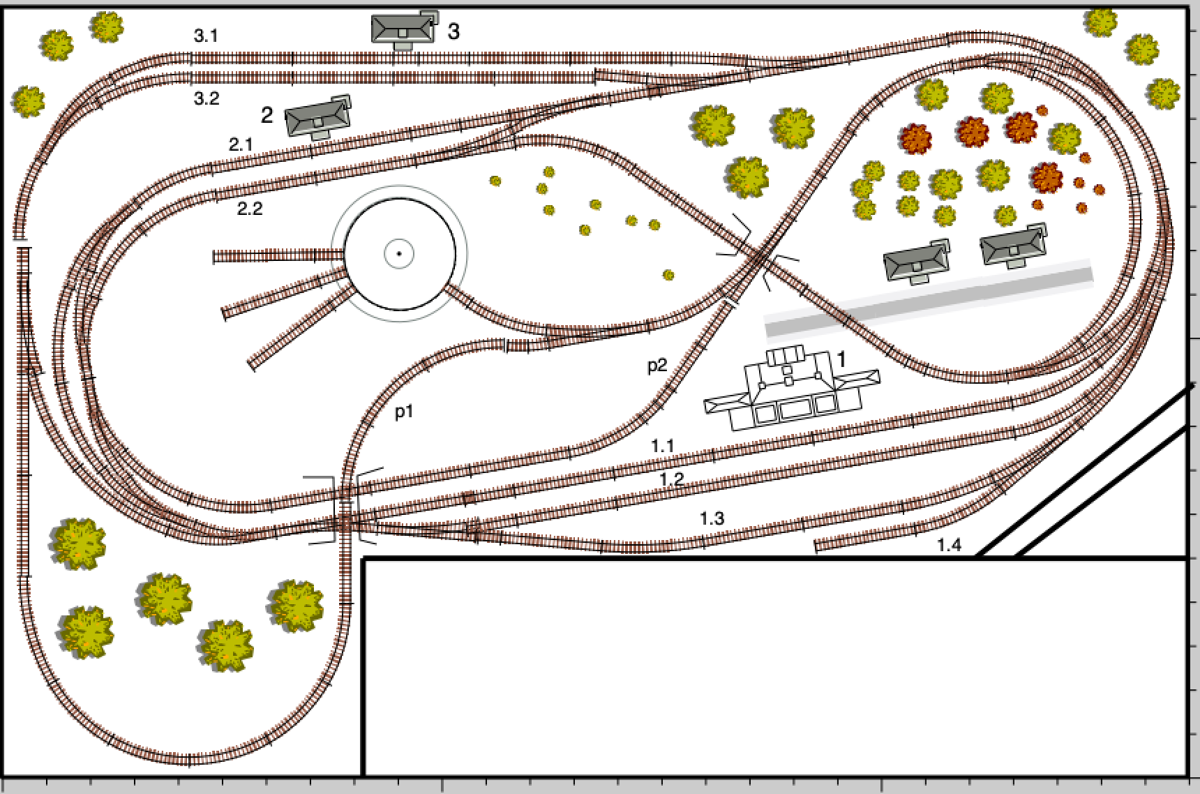 Z toho mi vyplynulo postavit si kolejiště takové, na kterém si budu moci co nejvíce věcí vyzkoušet. Mám základní okruhy od Roca s podložím A,B,C,D,E. Chtěl jsem minimálně 2 nádraží, ideálně 3, ať je variabilita. K tomu jsem si řekl, že bych si přidal vnitřní 8mičku (abych měl flexibilitu co se týče změnu směru jízdy, otestoval si zpětnou smyčku). Abych využil i trochu prostoru, který mám do L, tak mě napadlo si onu 8mičku trochu rozšířit právě tou kolejí p1 a tím prodloužit délku. Když jsem si to nakreslil, tak jsem zjistil, že to mohu celé pootočit a trochu více využít rohy, čímž mi vznikne prostor pro 3 nádraží, které může být také průjezdné. To vše co nejvíce zakomponovat a položit na desku, ať nemusíme být na zemi. Je mi jasné že zadní dvě nádraží č.2 a č. 3 budou výše, ale to jsem chtěl řešit zatím podložením například deskami a nemusel bych nic extra konstruovat, až na stoupání, klesání a dva mostky. Většinu kabeláže bych schoval do kolejí, pokud byl to nešlo, tak by ležely na povrchu, nebo bych si pár otvorů do desky vrtnul.