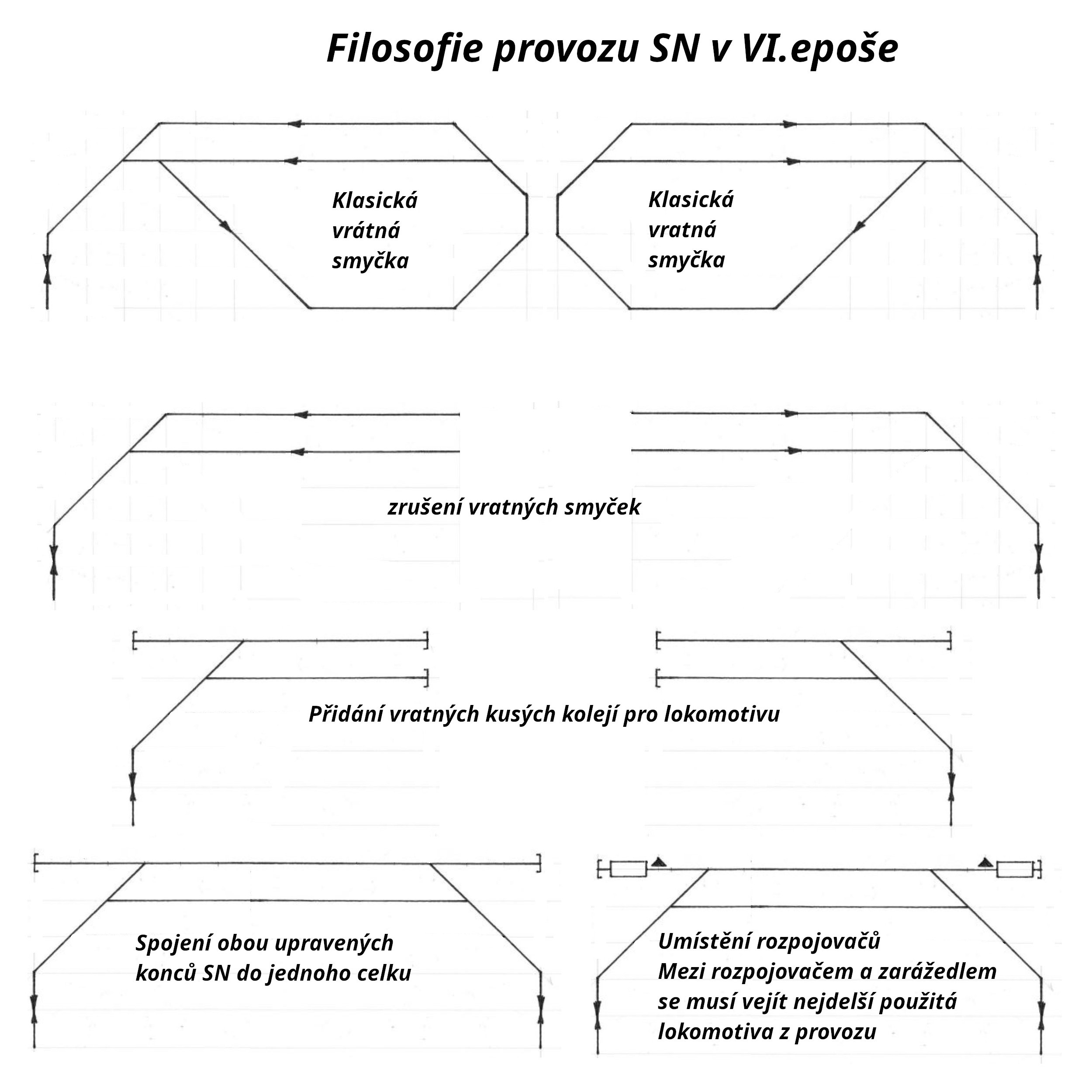 Jak sami vidíte dochází zrušení klasických vratných smyček. Upravené konce stanic scelíme a vytvoříme jeden celek pro klasickou modelovou trať, ikdyž pohledem to vypadá, že se opět jedná o klasický ovál. Modelář plnohodnotně využívá užitnou délku staničních kolejí v SN. Ušetříme jedno patro, protože většinou SN s vratnou smyčkou jsou umístěné nad sebou. Tím, že je hodně zredukovaná nákladní doprava, postačí nám jedna nákladní souprava. V případě, že by vznikly námitky, že se těžko bude kontrolovat odvěs/napojení lokomotivy na nákladní vozy, tak doporučuji v dnešní době nainstalovat mini web kamery spojené s mini monitorem nebo chytrým telefón.