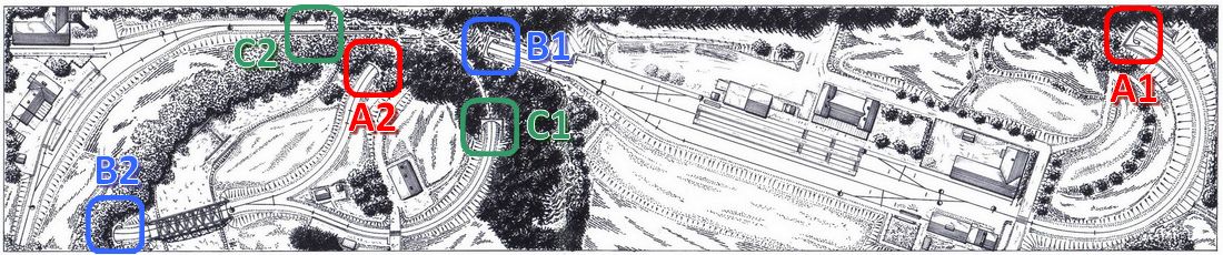 Ak vlak vychádza z vrchného (menšieho) skryťáku ide na E, vyjde na lokálke, prejde cez odbočku a po hlavnej trati pokračuje F -> B' -> B.