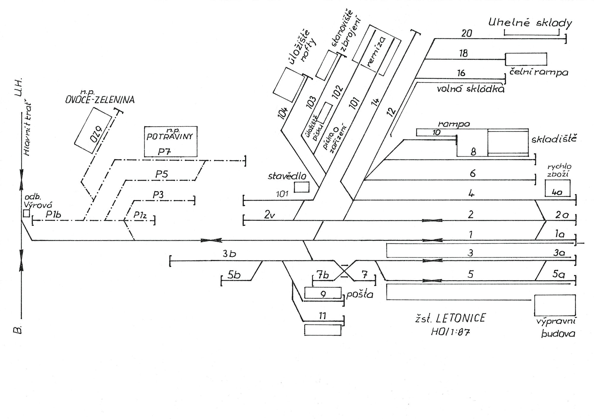 Pod výpravní budovou na hlavní trati vyčkává nedočkavě na volno sergej s části manipulačního vlaku. Zbytek nákladní zátěže nechal v poslední stanici, kterou obsluhoval. Celý manipulační vlak by se nevešel do stanice Letonice a i tak je o něco delší. Bude muset zajet až do šturcu a pomoci 735, vozy rozposunovat. Stále svítí červená, až teď se nám vynořil motorový rychlík „Hlučan“ směřující do Uherského Hradiště, tentokrát na Ostravu, do nějakých Kunčic. Odbočka Výrová je volná a na návěstidle svítí zelená se žlutou. Manipulák se dává do pohybu a my si z kabiny lokomotivy během jízdy prohlédneme stanici. Míjíme odbočku a mírným stoupáním míříme do stanice. Po levé straně ve směru jízdy, vidíme vlečkový areál n.p. Potraviny a OVOCE-ZELENINA, kdy nám rosnička vesele šíbuje vozy s banány na kolej OZ. Po pravé straně vidíme odstavnou kolej pro osobní přípojné vozy. Zrovna od vozů odchází úklidová četa. Vozy jsou čisté a uklizené. Zde se odstavují jen výše zmíněné vozy z osobní vozby. Sergej zarachotil koly na výhybkách a pomalu se přibližuje po koleji 2 do šturcu. Zastavuje u zarážedla. Je to tak, tak. Ve spolupráci s 735 začíná koncert. My jej nebudeme rušit a jen v rychlosti si projdeme stanici a začneme hned u nákladového obvodu. Kolej 4 musí být neustále volná a na kusé koleji 4a se přistavují vozy s rychlozbožím. Na koleji 8 a 10 skladiště s rampou. Kolej 12 spolu s koleji 16 tvoří volná skládka, kolej 18 slouží víceméně Mototechně k vykládce osobních automobilů, koukáme že zrovna nám sjíždějí ze železničního vozu poslední škodovky. A kolej 20 ? Uhelné sklady, ikdyž snaha je postupně přecházet s topením na plyn, postup plynařů je prachbídný. Koleje 6 a 14 tvoří něco jako koleje třídící. Lokomotivní depo o čtyřech kolejí 101 až 104 tvoří celé zázemí pro motorové lokomotivy a vozy. Páru už dávno odval čas. Koleje 101 a 102 končí v nové moderní lokomotivní remíze se sociálním zázemím. Houknutím nás pozdravil známý z barči, stojí u pískovacího zařízení pro doplnění suchého písku. Na koleji 103 náš brejlovec od rychlíku, tankuje a doplňuje potřebné maziva. Z cisterny stojící na koleji 104 stáčejí do podzemních nádrží naftu.