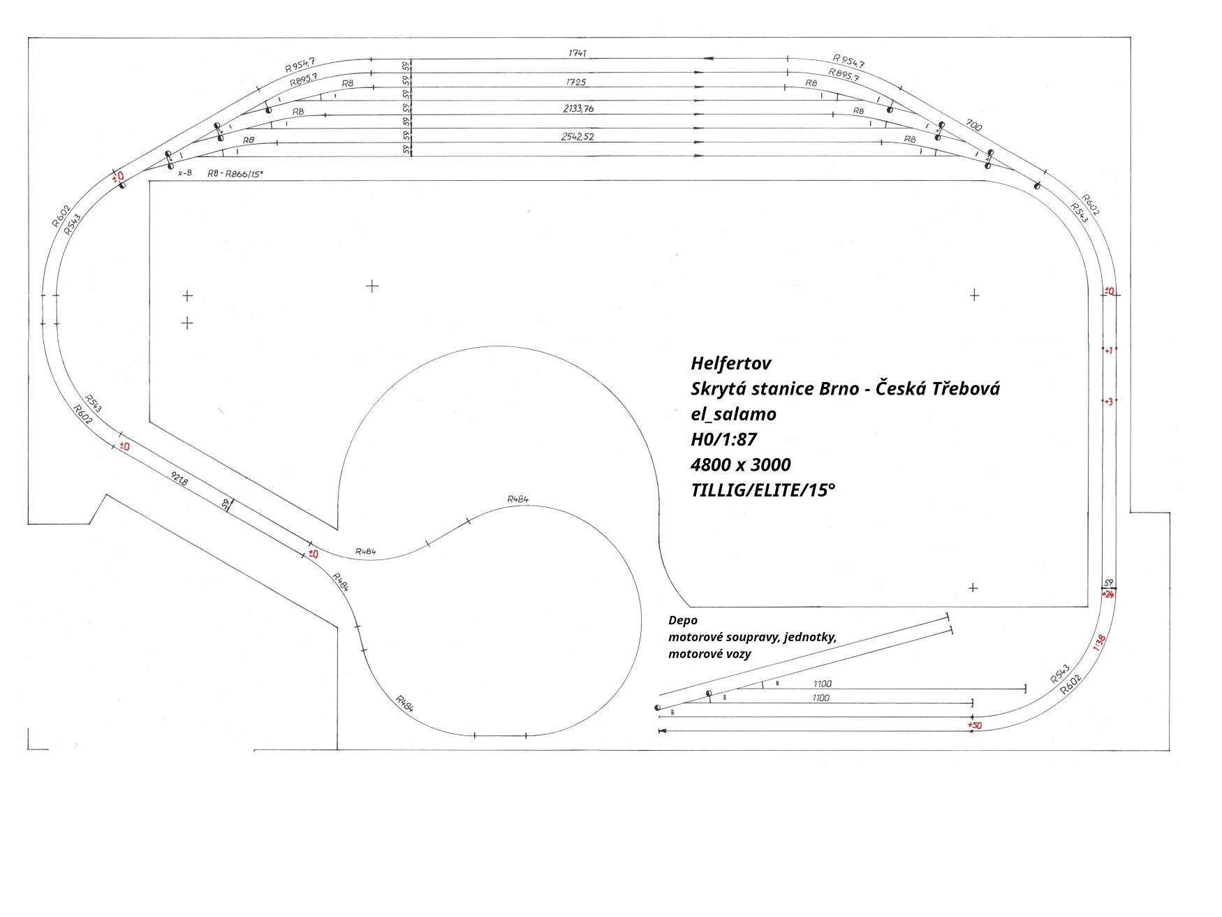 Já jsem zvolil svoji dost tradiční klasiku. V suterénu je skryťák Brno/Česká Třebová s vratným obloukem, depem pro motorové jednotky, soupravy a vozy. Následuje spirály 2 a 1. Na odbočce Klepačov se hlavní trať rozdvojí a vzniká nám tzv. velká smyčka s vlakotvornou stanici Helfertov. Stanice má bohaté zázemí na přilehlých vlečkách s nákladní zátěži jak pro import, tak i pro export. Malé lokomotivní depo smíšené je určené pro lokální trať. Vy čuhuje z remízy Hurvínek/M131.1 jako záloha. Na lokální trať se dostaneme přes odbočku Arnoštov, přes výhybnu Lažánky, míjíme zastávku Rudice a trať končí v koncové stanici Podomí. Je zde jen železniční vlečka k skladu ZZN. Zemědělci si zřídili na kusé vlečkové koleji plochu z panelu, aby mohli zde vykládat hlavně vápno a když se zaštěstí i umělá hnojiva. Vše se vykládá z vagónu ručně, u vápna mají štěstí, protože jim bylo přiděleno vozidlo tatra s cisternou na přepravu vápna, které se používá při vykládce z vozu Raj.