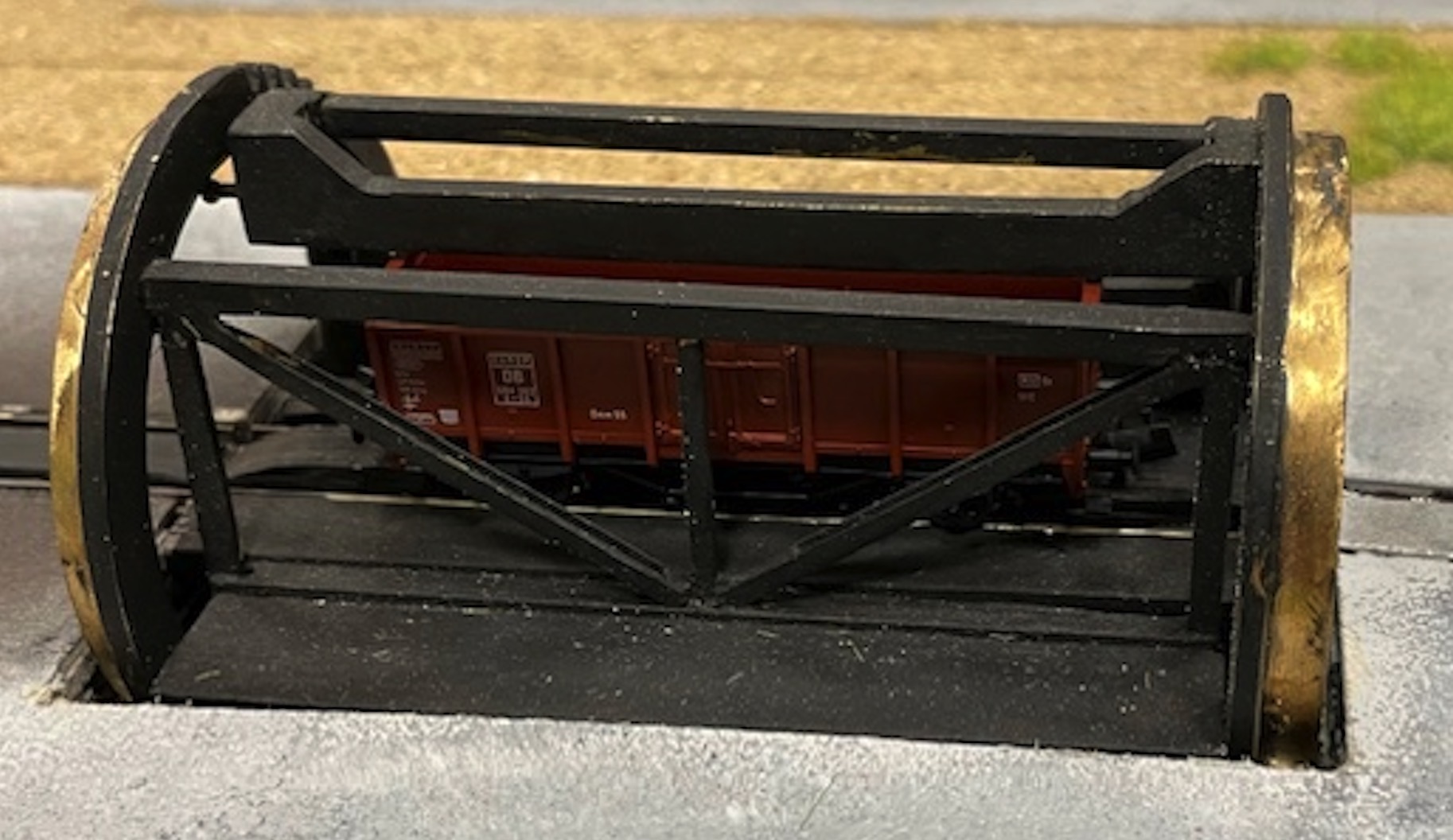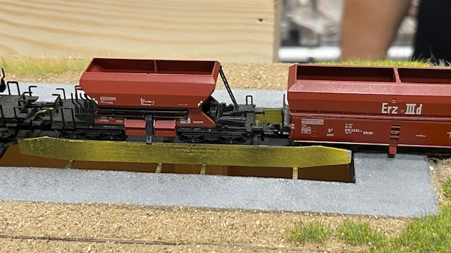 Zajimavou variantu se sypkým nákladem jsme měli možnost vidět v Børkopu u kolegů z Dánska. Je to modul v rozměru N. Sypké "Uhlí" se opravdo vysýpá (a funguje to) z otevřených vozů překlopením (tohle se v reálu používá ve Chvaleticích), vůz po vyklopení následně automaticky sjede, a oteřením bočních výsypek z vozů Wap a Faccs (prosím odborníky o opravu typů vozů).