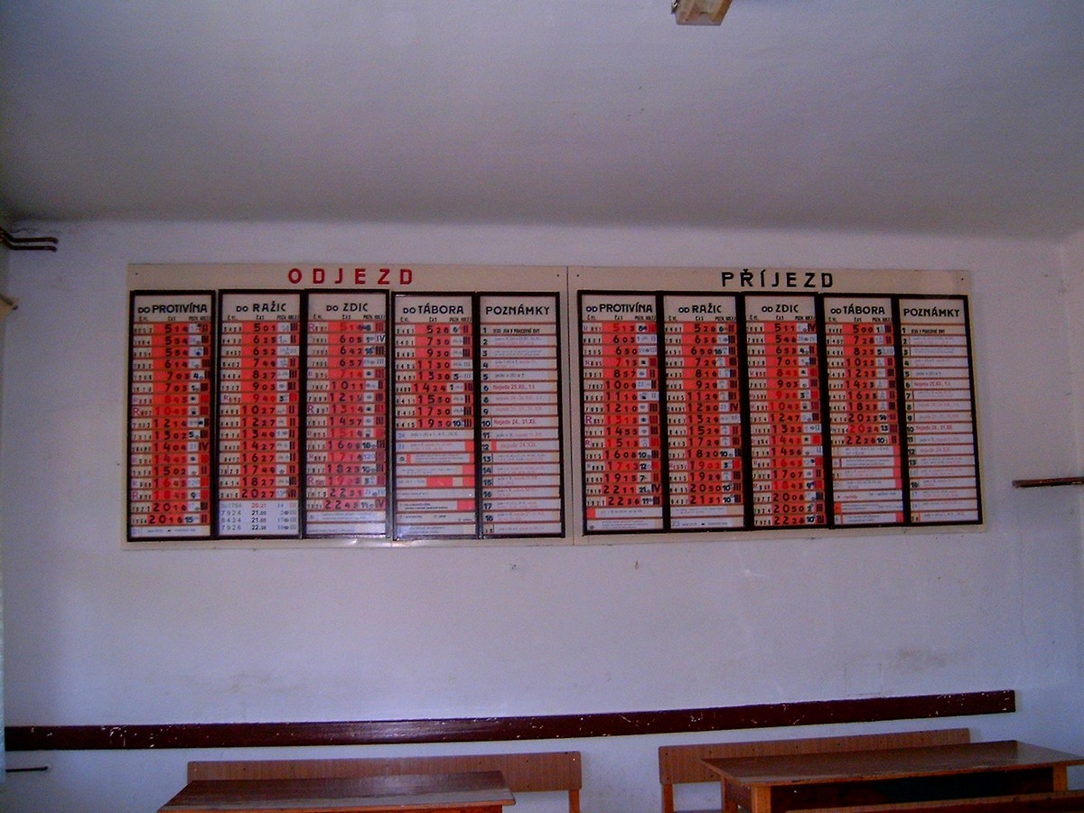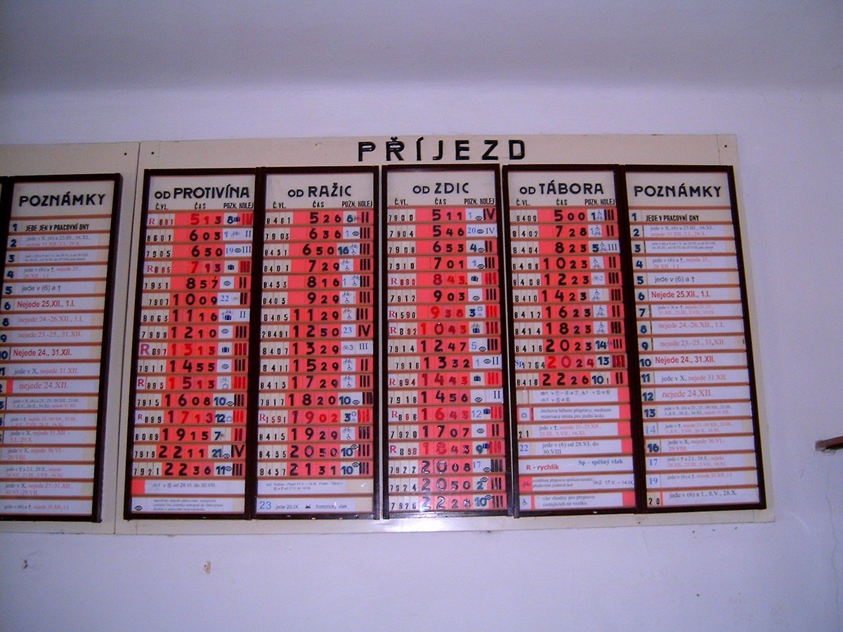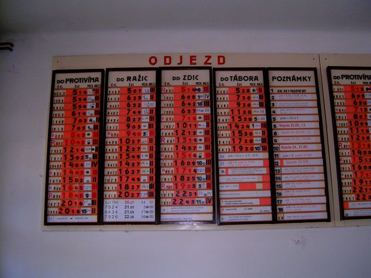 Ještě v 70. letech se na větších nádražích pro odjezdy používaly držáky směrových cedulí na vagóny. V Chebu byly okolo příchodu k vlakům v sadě kolejniček, u kterých bylo vždy příslušné číslo nástupiště a "parkovací hodiny" s nastaveným odjezdem. Na perónu pak byly na sloupcích (nebo na stojanech) u příchodu tytéž cedule vždy na té straně, kde měl stát příslušný vlak. Poslední byla samozřejmě na vagónu...