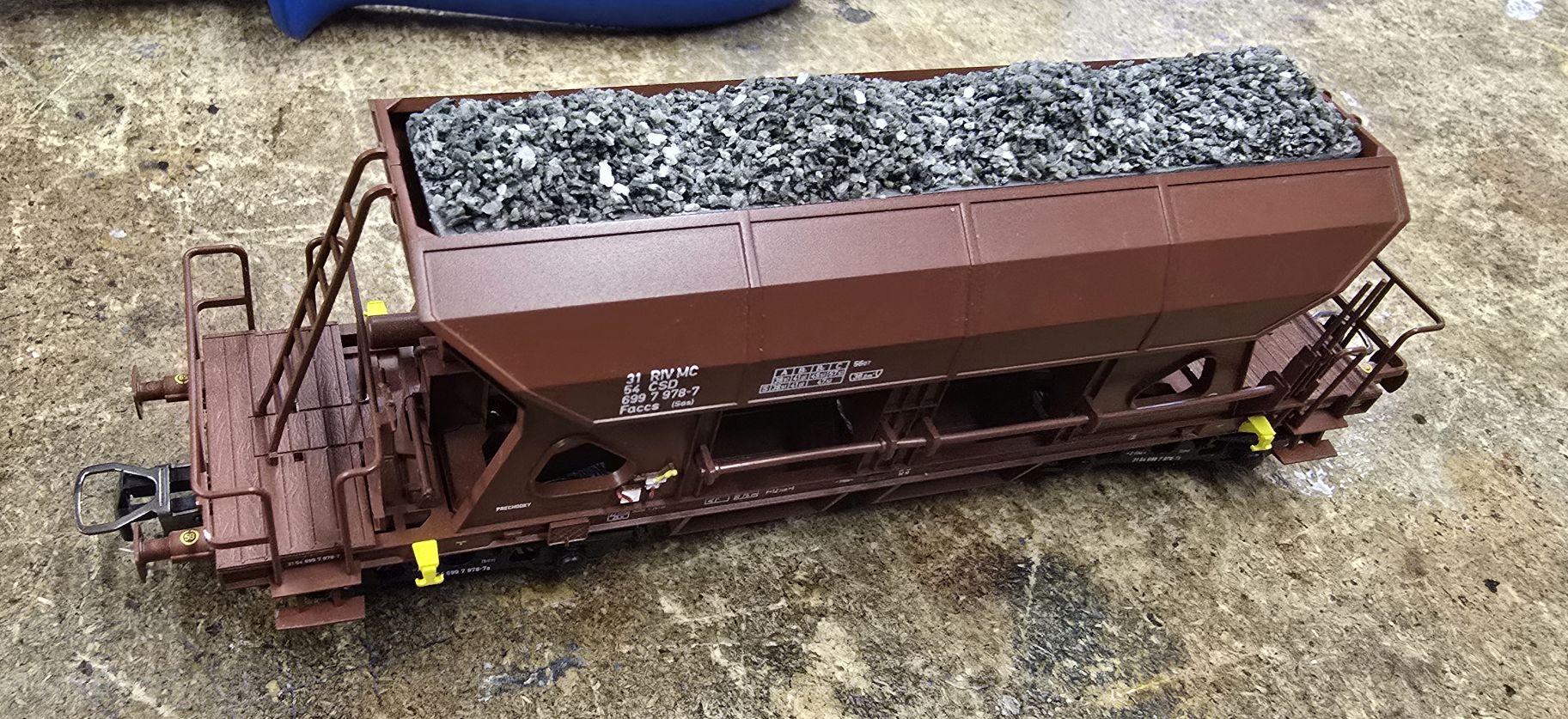 Střelec píše:Jak řešíte náklady do uhláků s šikmými či příčnými výztužemi napříč vozem v horním rámu skříně? Tam prostě nelze jednoduše zasunout blok s nákladem (vyjma vozů s jednou příčnou výztuhou uprostřed, tam jde půlený). Zkoušel jsem volně sypanou imitaci uhlí, ale to má své mouchy. A trvale umístěný náklad (zalepené "sypké hmoty") také není to pravé.
