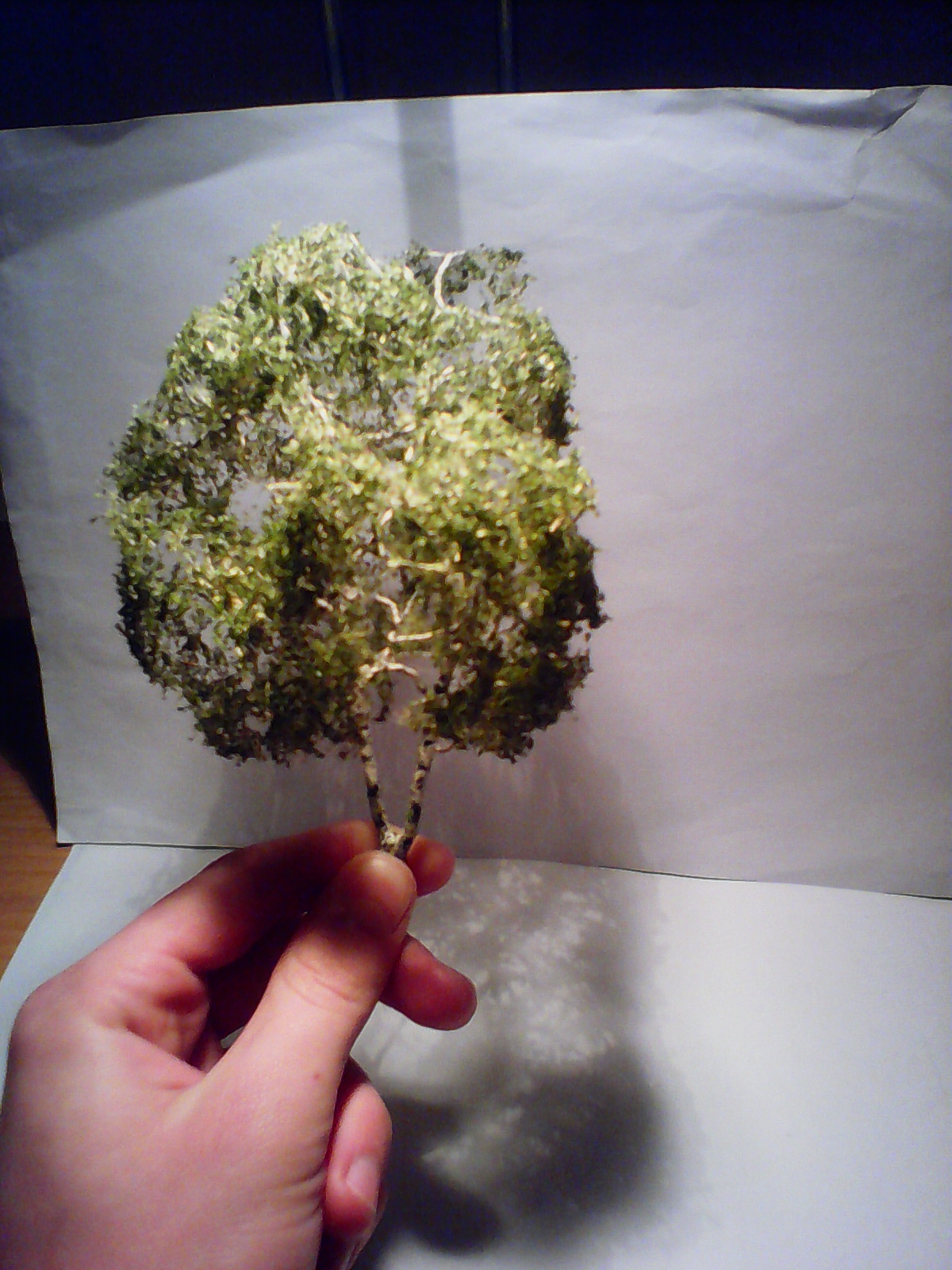 No, jelikož kecat, jaká je realita, a vyrábět model jsou dvě diametrálně odlišné věci, připájím pár obrázků. To velké měla být slivoň, ale v zápalu boje dodržet jakýsi tvar koruny slivoně jsem to asi přepískl s velikostí, to menší měruňka. Ale to ovoce stále chybí... Byla by chyba je neznázorňovat, když je na první pohled z větší dálky patrné. Na radu Norberta experimentuji s kořením, ale nějak se to nedaří... Od toho woodlandu by to nemuselo být špatné, seženu to někde v ČR? Ale asi by mi taky vadilo, že je to nepřirozeně jednobarevné. Otázka je, jestli by to bylo na modelu znát.