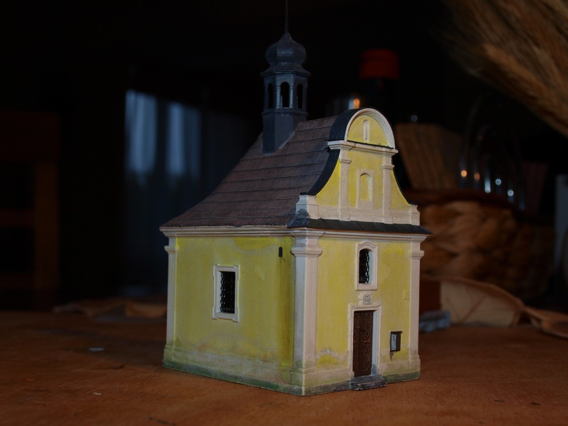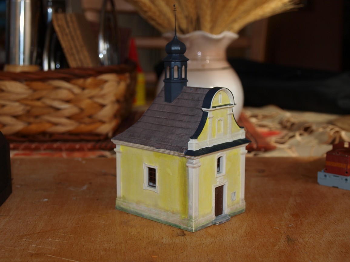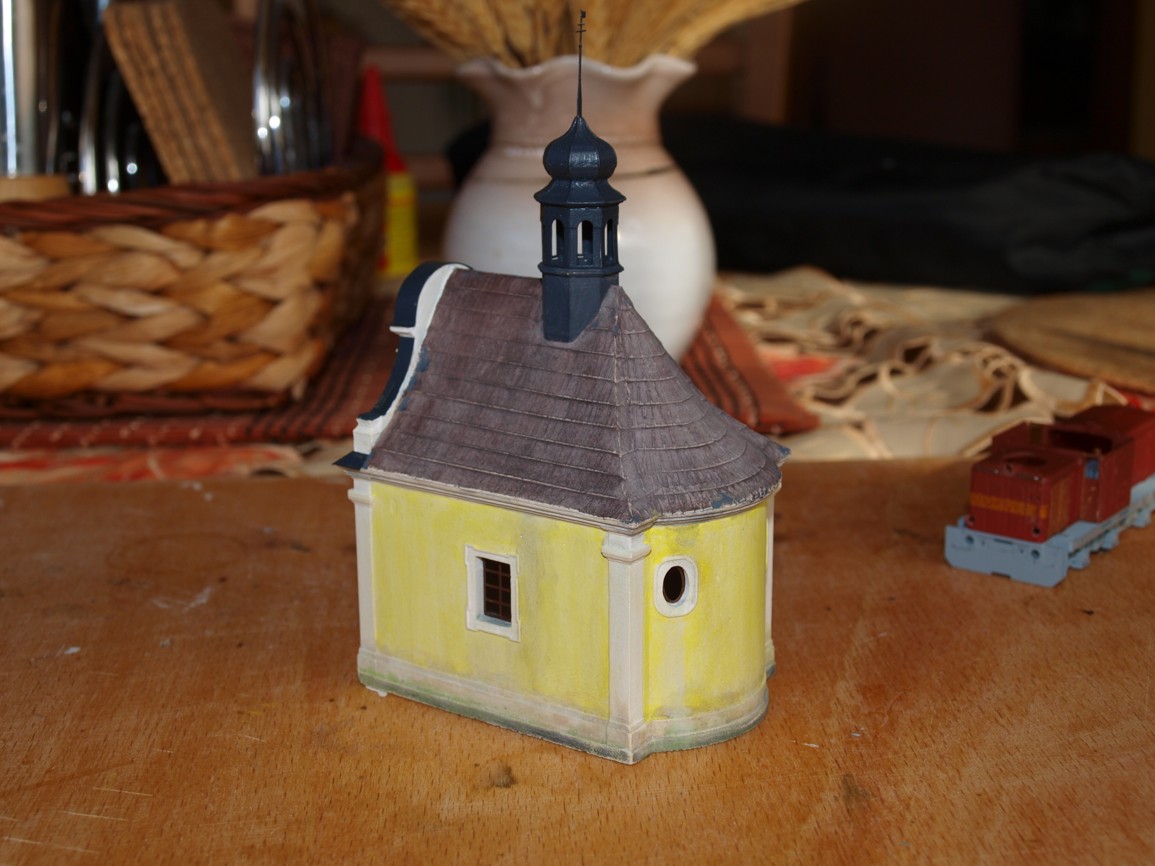 Ahoj, stavím kapli a nejsem si jist dosavadním výsledkem. Jde mi o odstín střechy. Mají to být dřevěné šindele. Není to sice finální podoba, spíše základ po další patinaci olejovkami a křídami, ale prostě mi to připadá, že to není ono... Kaple je sádrová a je barvena obyčejnými vodovkami. Finální podobu si představuji jako zašlou relikvii socialismu 70-tých let.
