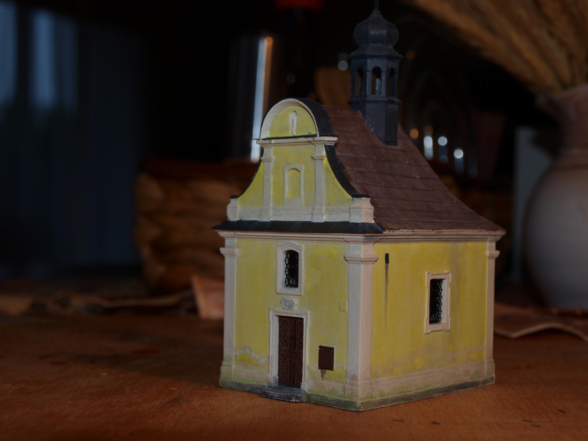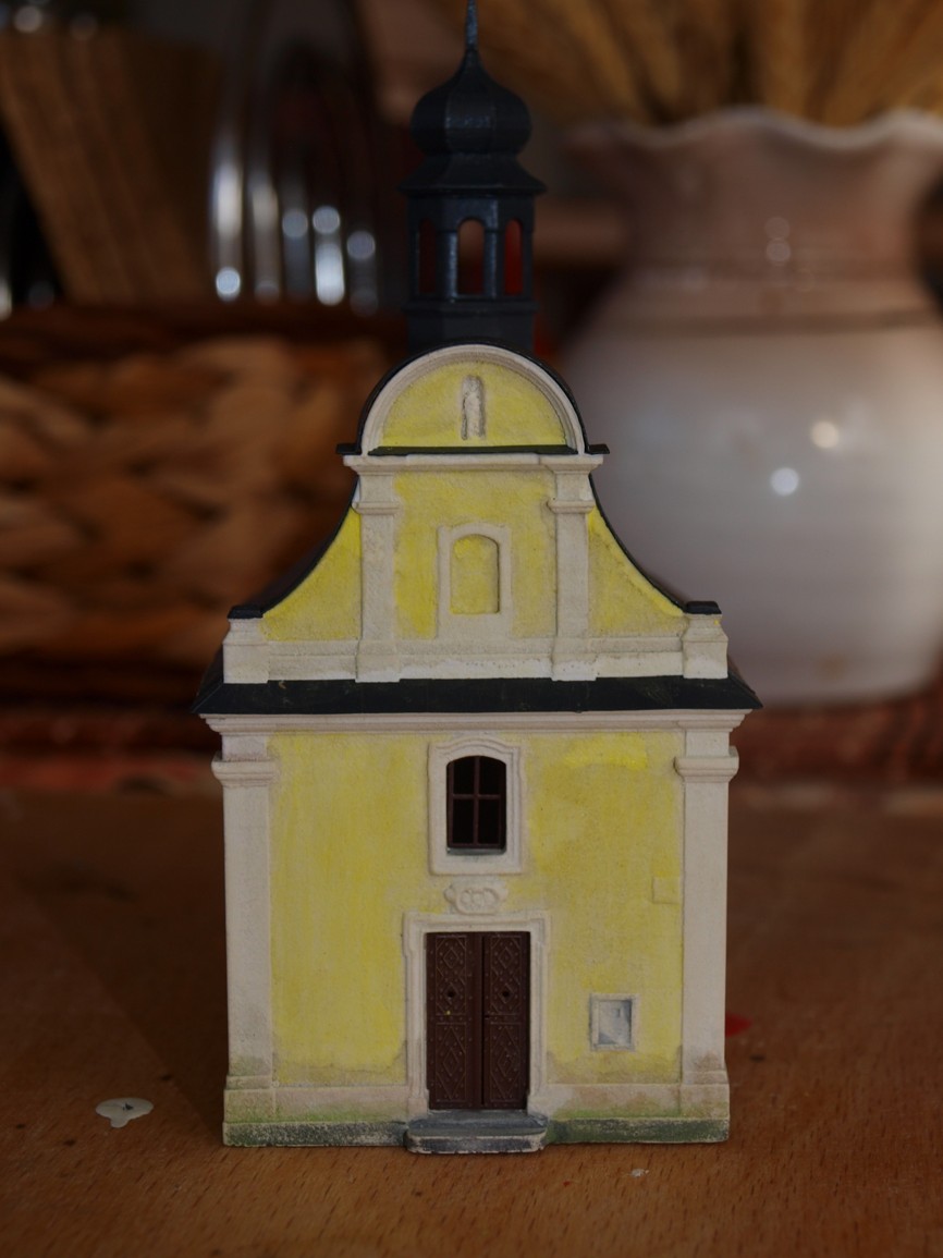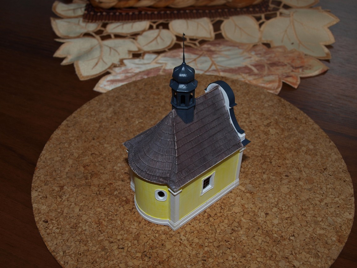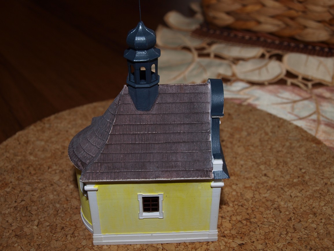Ahoj, stavím kapli a nejsem si jist dosavadním výsledkem. Jde mi o odstín střechy. Mají to být dřevěné šindele. Není to sice finální podoba, spíše základ po další patinaci olejovkami a křídami, ale prostě mi to připadá, že to není ono... Kaple je sádrová a je barvena obyčejnými vodovkami. Finální podobu si představuji jako zašlou relikvii socialismu 70-tých let.