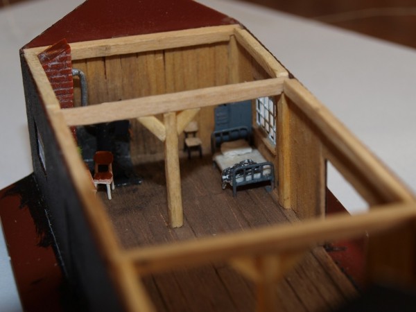 doplněna skříňka a postel. Vše vyrobeno z balzy, papíru a drátu.