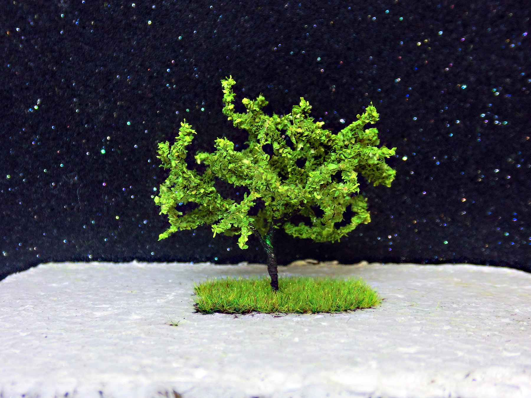 Dnes jsem vytvořil svůj první strom. Něco jako jabloň. Výška je 45mm. Na kousek polystyrenu jsem zasel pomocí flokovačky na koleně ze součástek doma dělané trávu 2,5mm Snad se to povedlo. Tchán mi daroval svou sbírku starých lokomotiv a vagonků tak se do toho pustím. Zkoušel jsem i smrček pomocí drátku a koudele, ale tam ještě řeším barvu.