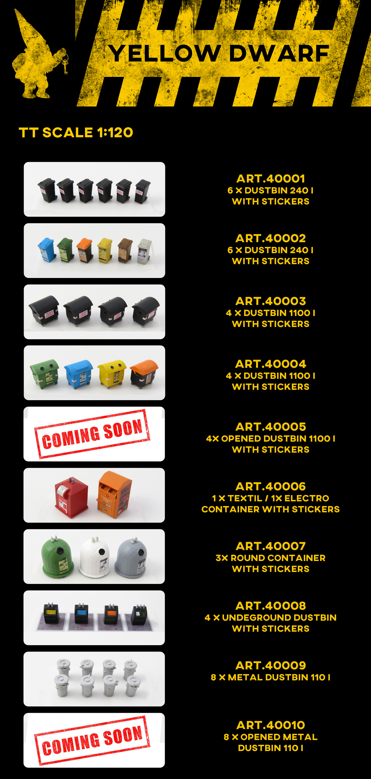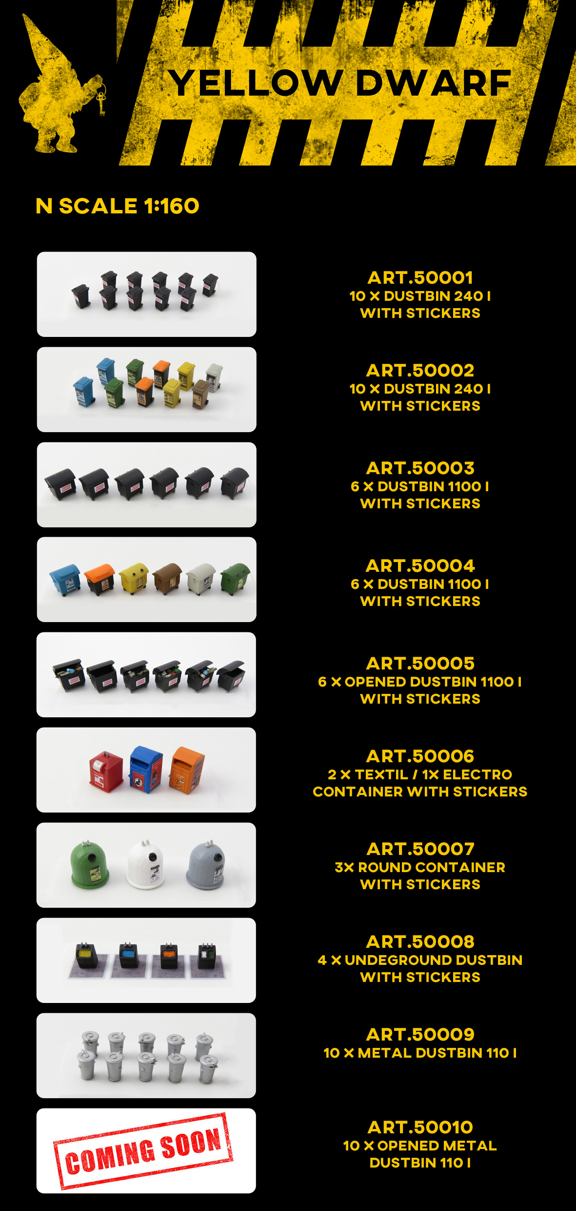 nespokojen s množstvím a kvalitou doplňků ve velikosti N, založil jsem značku YELLOW DWARF, pod kterou chci i ostatním modelářům nabídnout něco málo z doplňků modelové železnice. Prioritně nyní ve vel N, následovat bude i TT a něco málo i v H0. Zaměření spíše na modernu, ale budou i výjimky viz. např. popelnice Art.50009. Pro začátek startuji s tímto sortimentem, který chci dále rozšiřovat. Budu rád za jakékoliv postřehy, nápady či zájem. Pro začátek více zde: http://frankystinyrailroad.blogspot.com ... dwarf.html