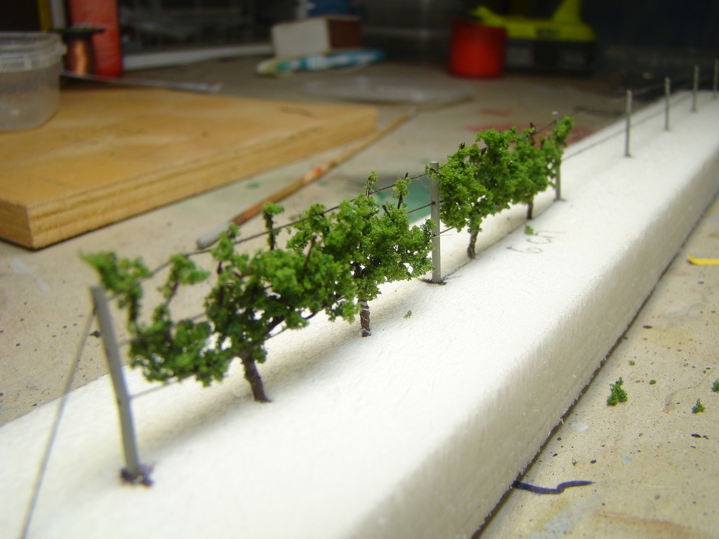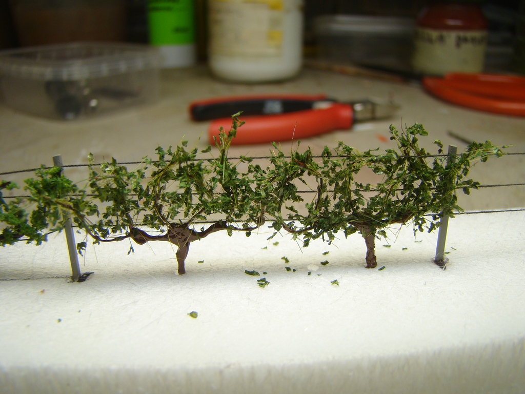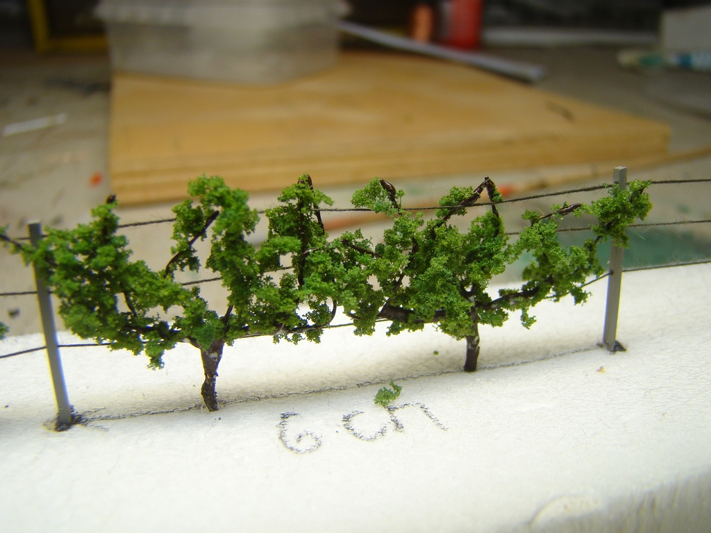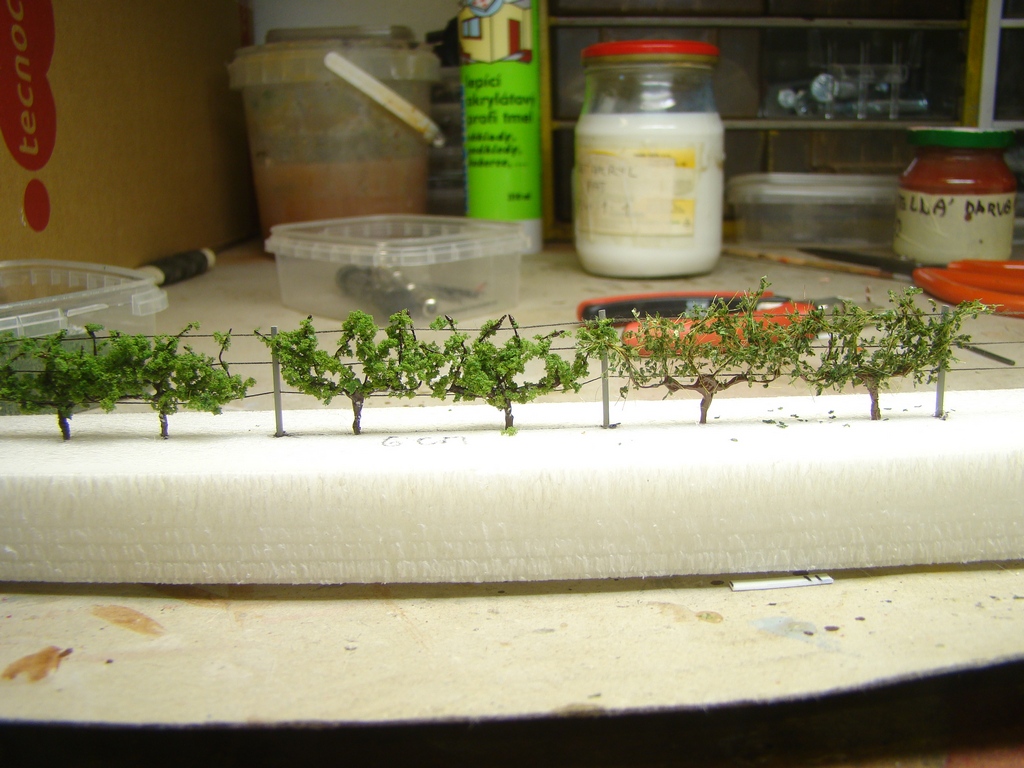 Tot teorie. Ja jsem zacal pokusny vinohrad ( velikost H0) delat ze plastovych hranolku 1x1mm. Navrtal jsem do nich vrtackem tri dirky na provleceni dratu. Dale jsem se dostal na tvorbu vlastnich sazenic. Prozatim cekam az to zaschne. Ma nekdo nejake napady co stim dale? Jak to delat jinak?