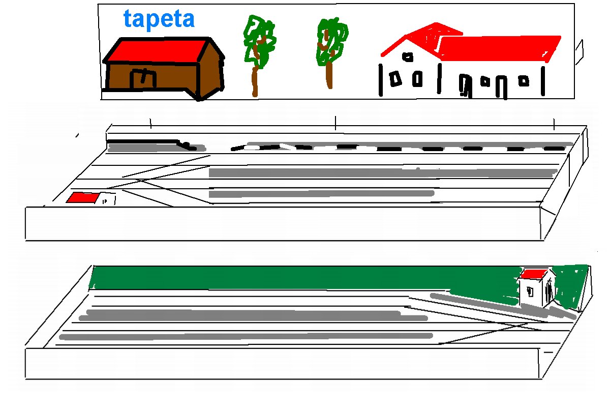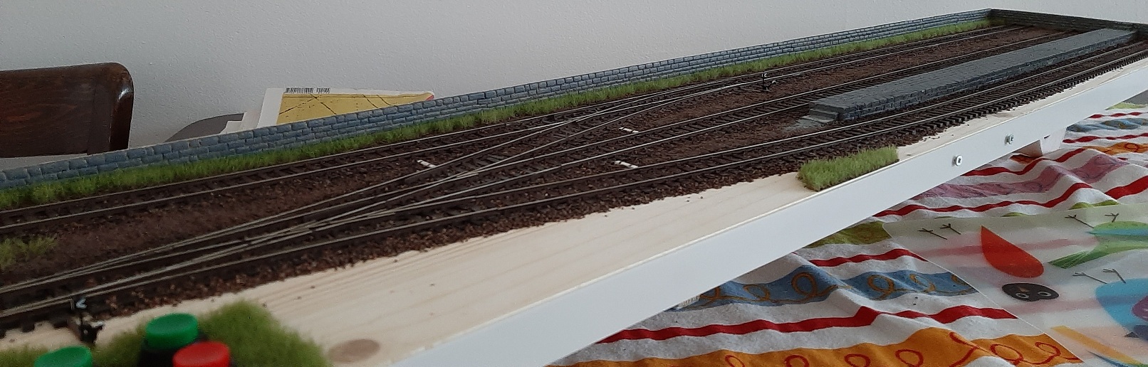Úvodní představa byla udělat ke všem kolejím sypaná nástupiště, k té nejvzdálenější udělat nástupiště vyšší a z něj v místě výhybky "schody nahoru pryč". Zbytek hrazení udělat jako kamennou zídku ze styroduru, případně kamuflovat svahem kde to půjde.