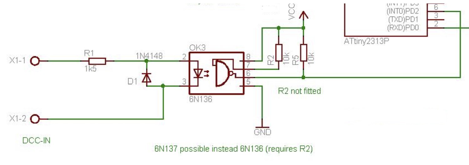 - optočlen pro vstup DCC signálu z kolejiště - schéma níže, je dobré využít tento obvod, protože tvaruje signál, Fulda doporučuje i low-pass filtr pro odstranění rušení