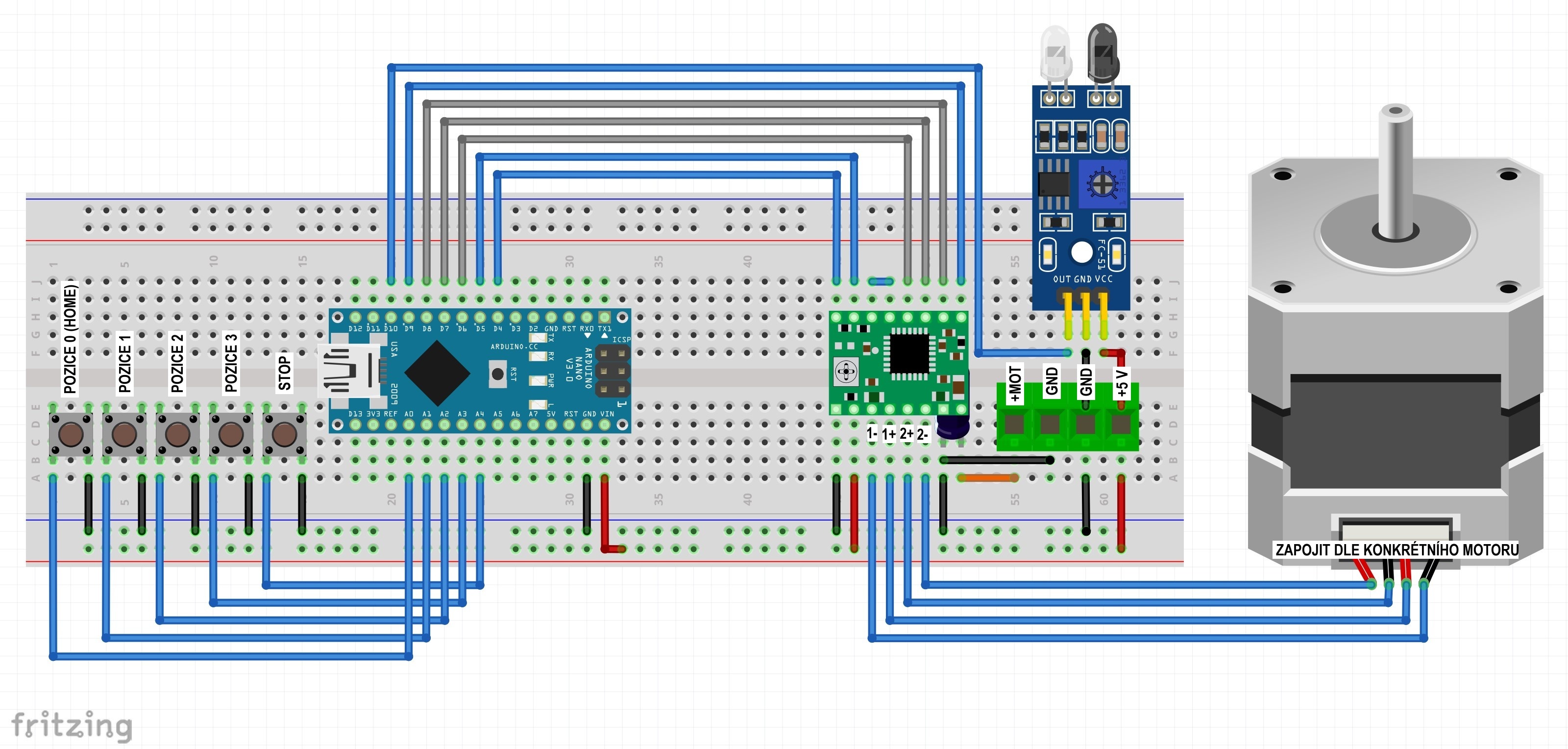 Pozn: šedé vodiče mezi Arduinem a driverem A4988 není třeba zapojovat hned, pokud nepoužijete mikrokrokování.