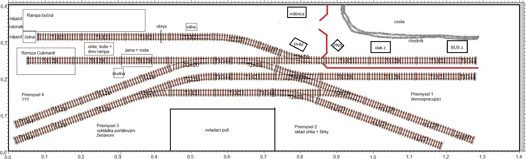 - Rád by som využíval aj lokomotívy a vagóny stredných dĺžok (12-14m), preto je layout asi väčší, ako by bolo treba. Proste by som bol rád, aby sa tam dali pohodlne posunovať na kusých koľajách aj dva "stredné" alebo 3 "malé" vagóny. Nie je úplným cieľom mať čo najmenšie vozy a čo najkratšie koľaje. Chcem to pre zábavu, nie trápenie.
