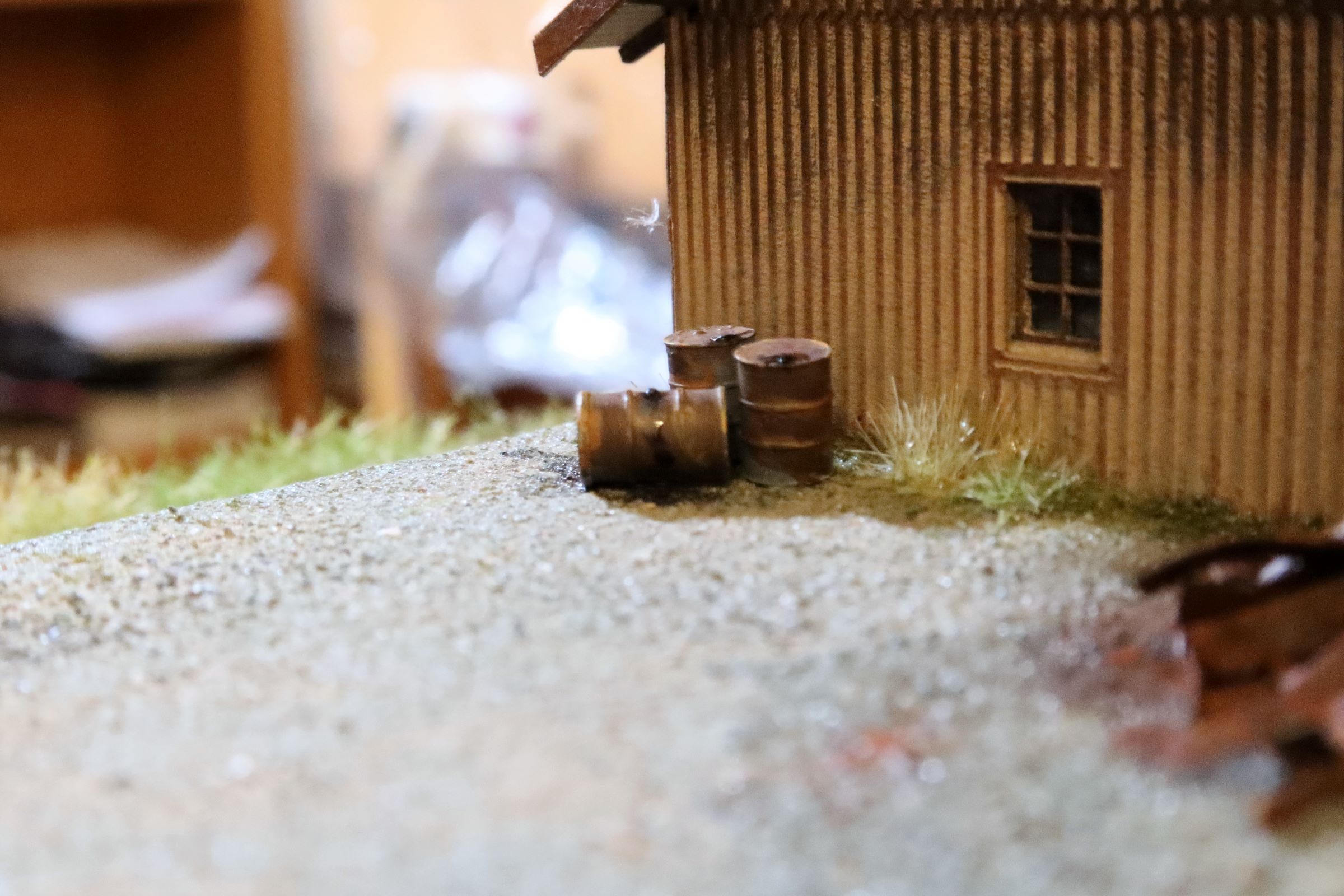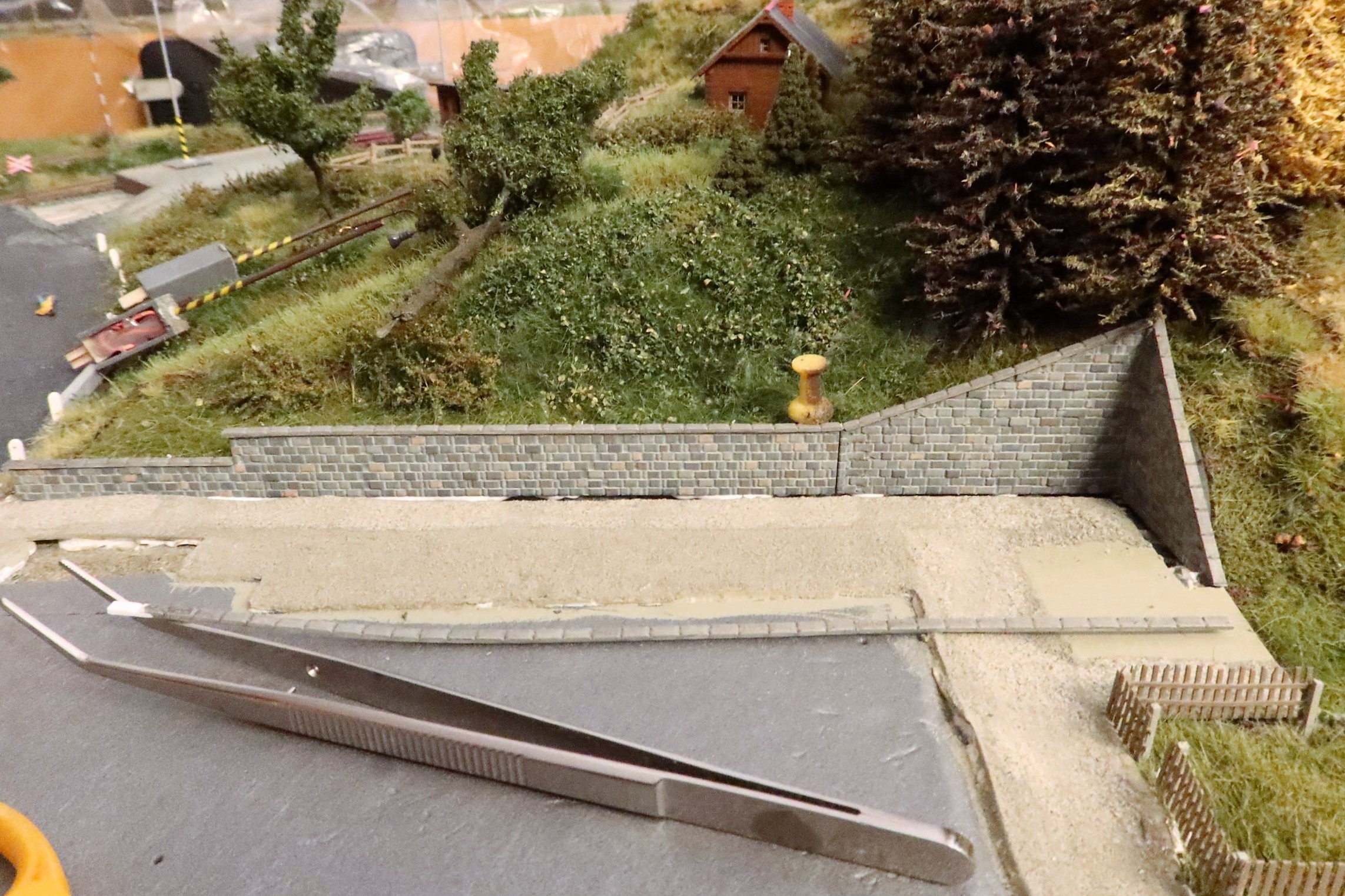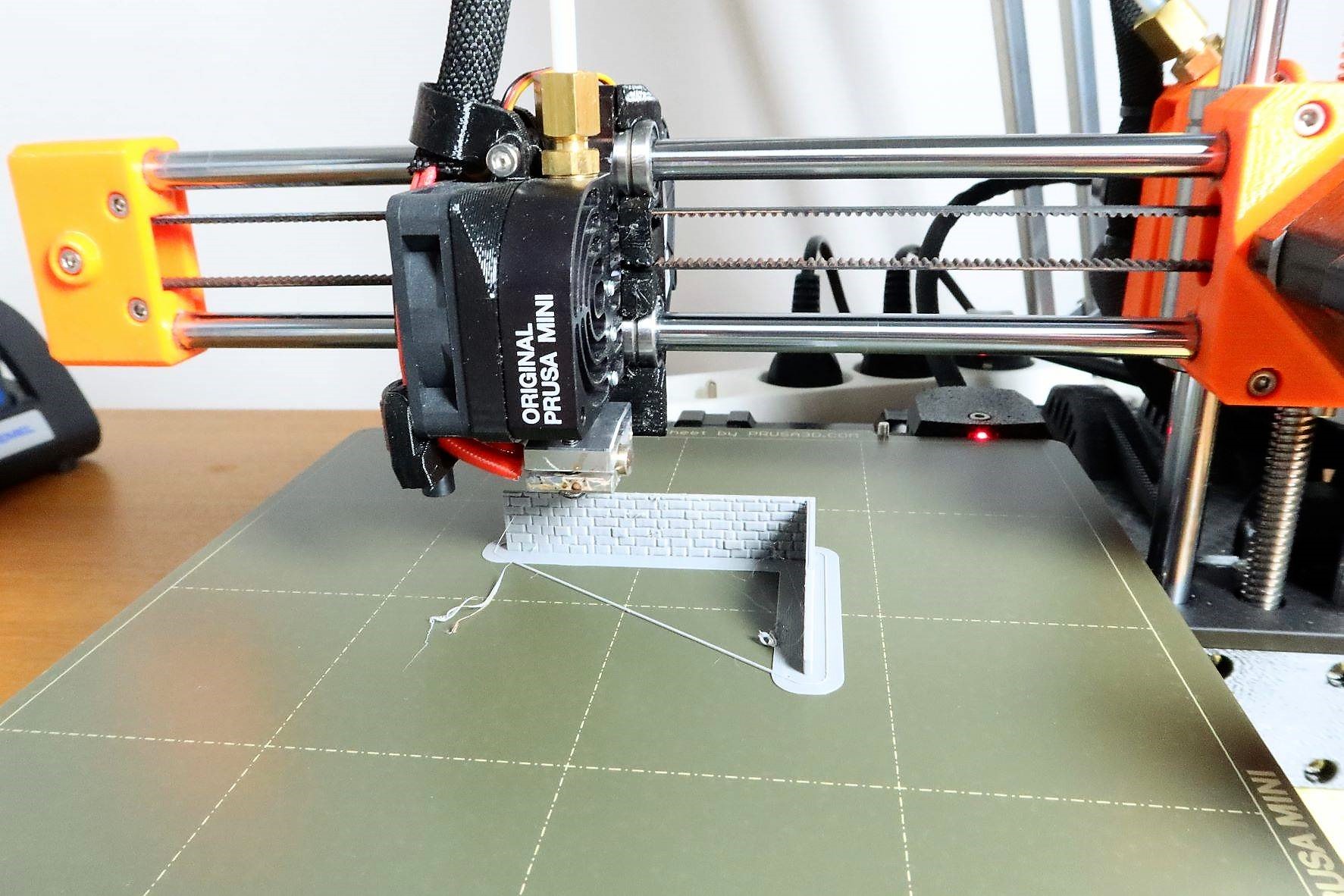 Pak jsem se pustil do realizace opěrné zdi. Tentokrát jsem zvolil 3D tisk, i když kvůli délce jsem to musel udělat nadvakrát. Vytištěno z PLA na Průša MINI, 0,1mm vrstva. Pokusy jsem nakonec dospěl k názoru, že nejlepší výsledek je při tisku zdiva "na výšku", což vypadá dost nelogicky. Pokud se tiskne "naplocho", jsou vidět stopy pohybu trysky na kamenech - na to jsem narazil při tisku kamenného mostu (Čertův most) pro stejnojmenné dioráma. Při tisku "na výšku" dokonce není problém ani s nepravidelně přesahujícími kameny a mezerami. Sice ve výtisku jsou "vlásky" materiálu vzniklé pohybem trysky mezi výstupky, ale dají se pak celkem lehce odstranit. A kameny mají být nepravidelné, takže menší poruchy nevadí. Souhrnně - pokud započítáme dobu na vytvoření modelu, je to celkově o hodně pracnější, než to nastříhat z polotovaru od Bartáka