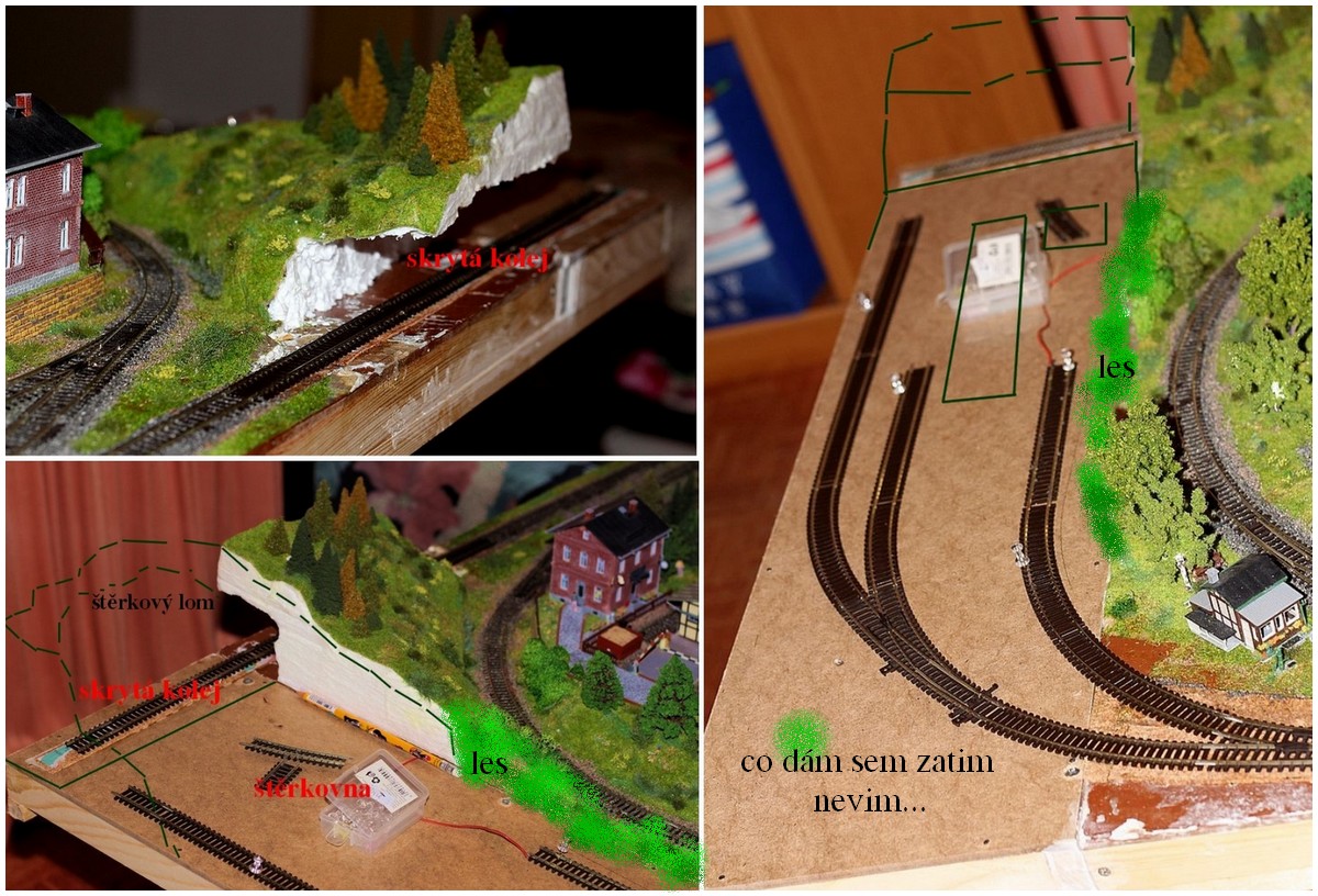 A nebo ty dvě kusé koleje využij jako skryté nádraží opticky oddělené od kolejiště nějakou kulisou apod. Rozhodně už tam žádný další okruh nedávej. Méně je v tomto případě více :wink: