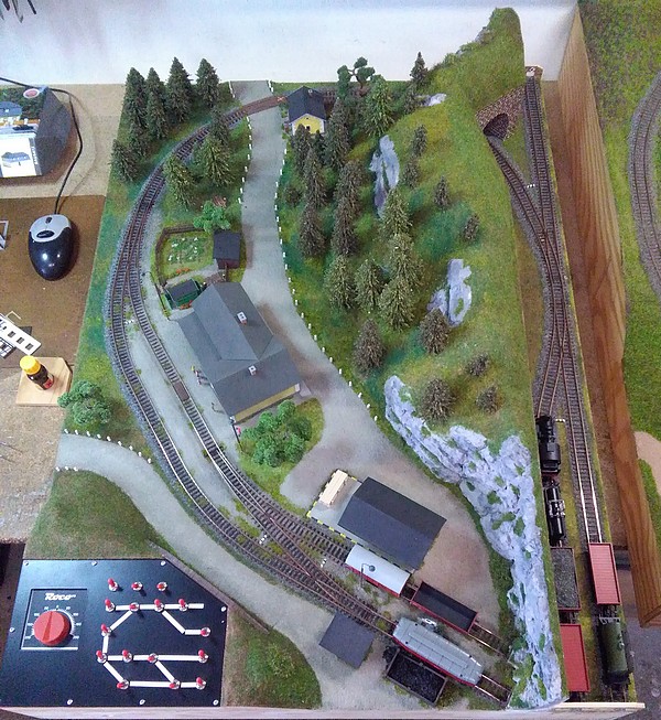 Dej tam vlečku a volnou skládku. Ovládací panel apod. bych tam nedával. Bude ti to rušit celkový dojem. Před časem jsem u velice podobného minikolejiště udělal naprosto stejnou chybu. :wink:
