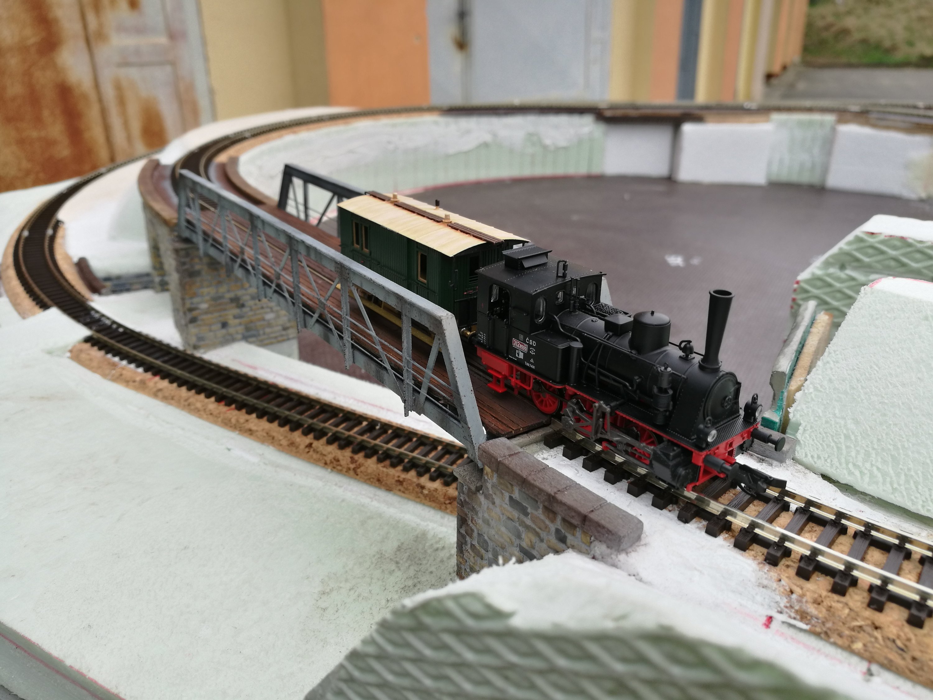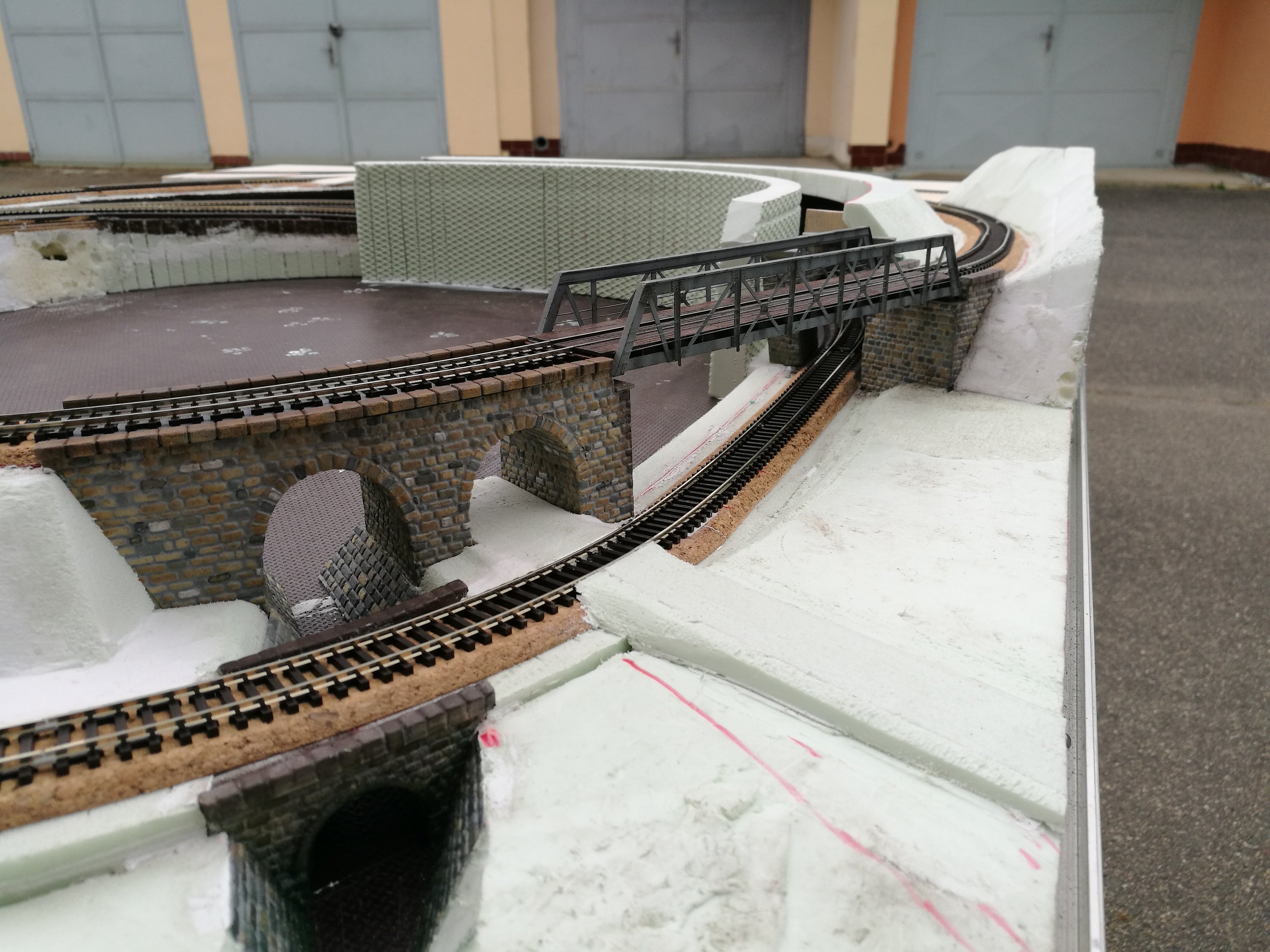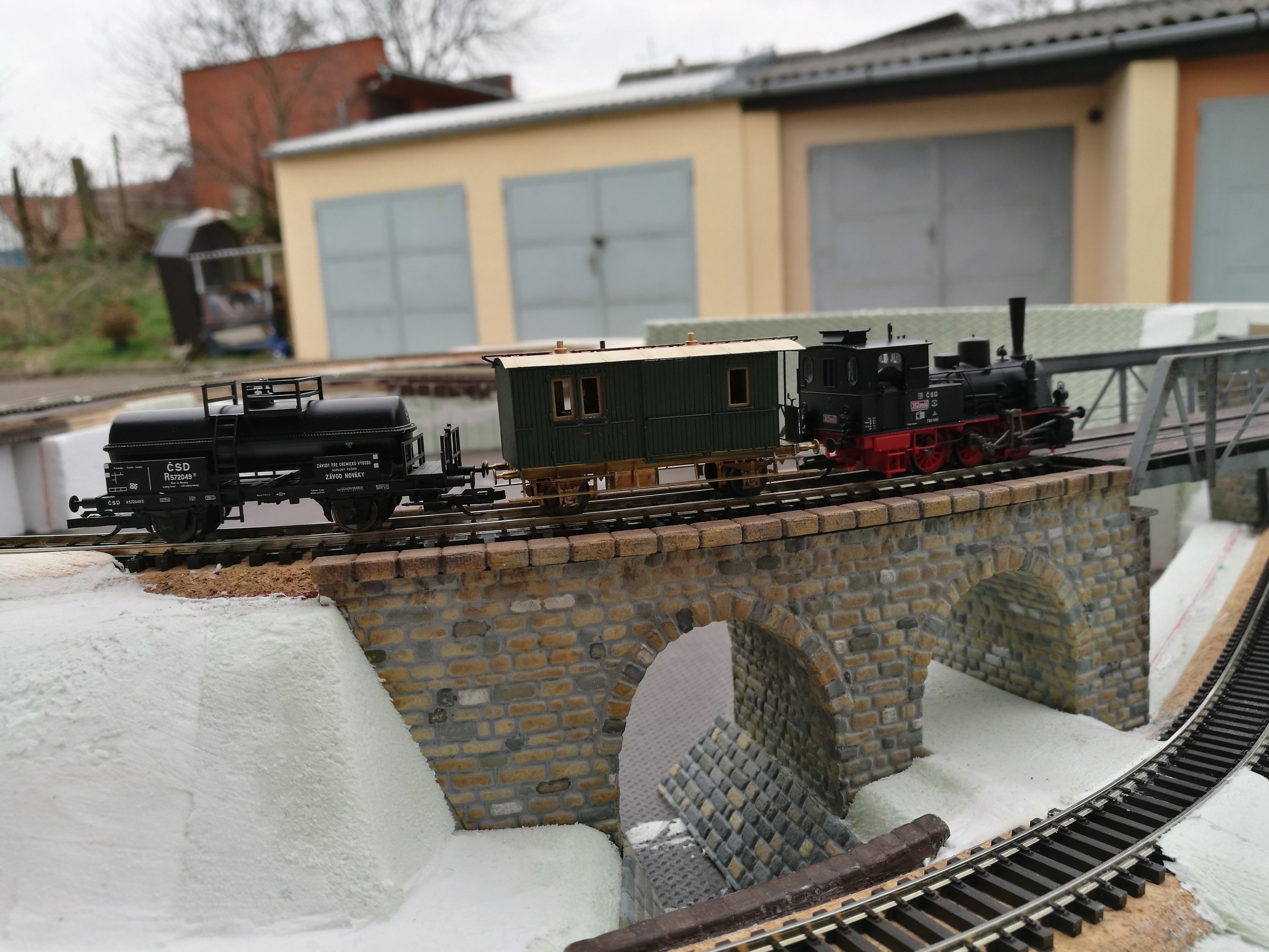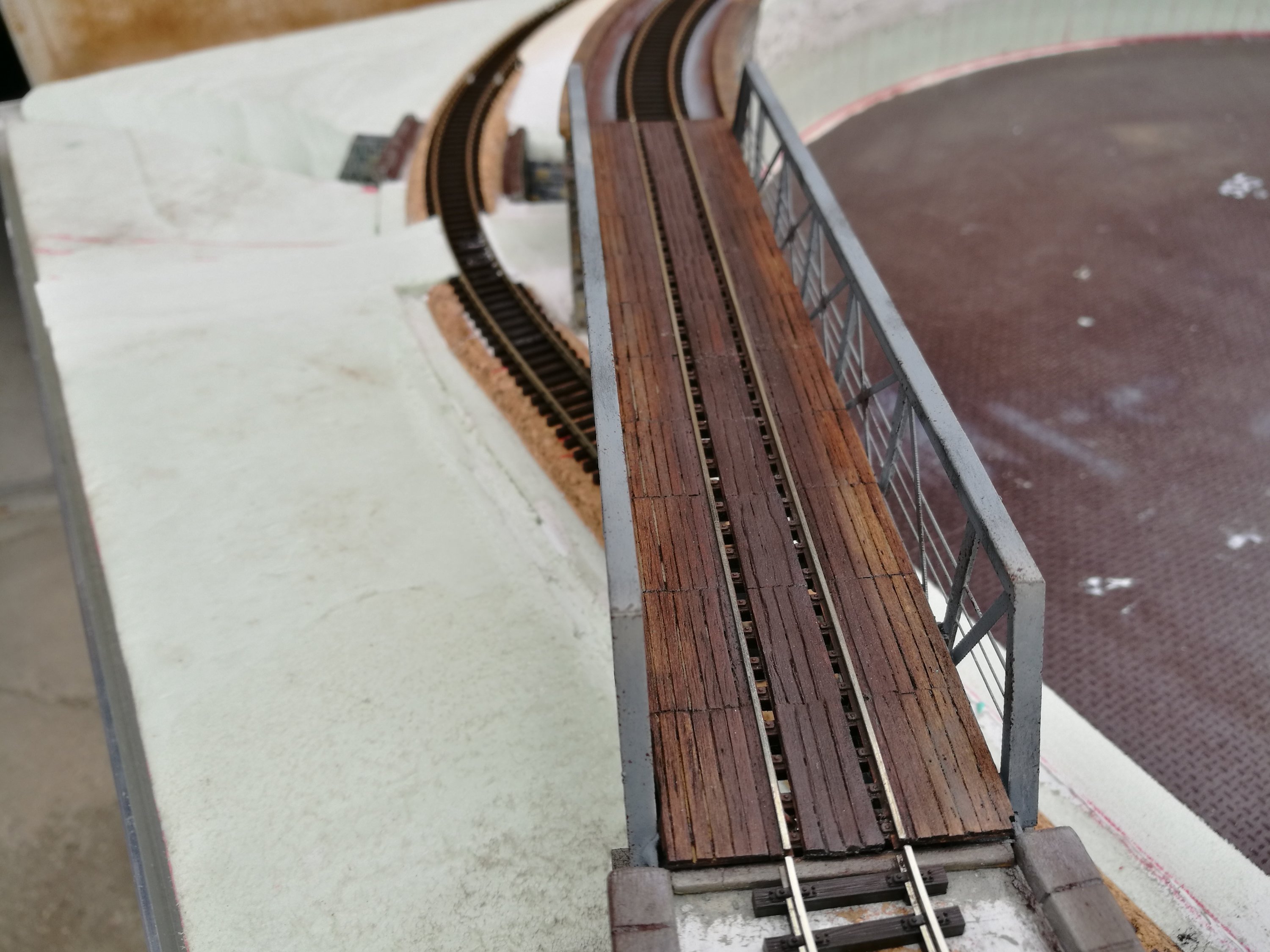 Upravil jsem obloukové výhybky a angličana. Provedl jsem korkové lože pod kolejnice a stavěl kamenný most a most od KB model, který jsem trochu upravil výměnou hlavních nosníků z kartonu za hliníkové a krablovaný plech za desky. Taky vznikla popelová jáma a na druhé straně dřevěný šturc. Jinak úprava výhybek přinesla vynikající jízdní vlastnosti vozidel.