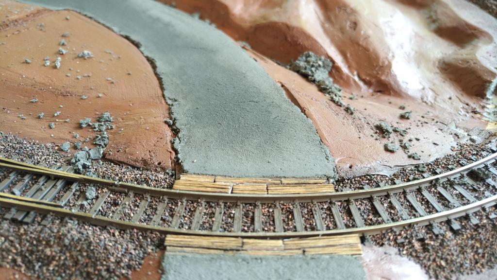 Jenže mi na záda dýchala moje práce, která na mne na konci roku pravidelně nakládá enormní požadavky a já to prostě nestíhal, tak jsem položil kus kartonu a potáhnul ho stejně jako zbytek silnice. Až bude chvilka, já to ještě dosochám (překreslím si to na správný oblouk a vytisknu si stejně jako v předchozím případě prefabrikát imitující položené kolejnice a předělám to)