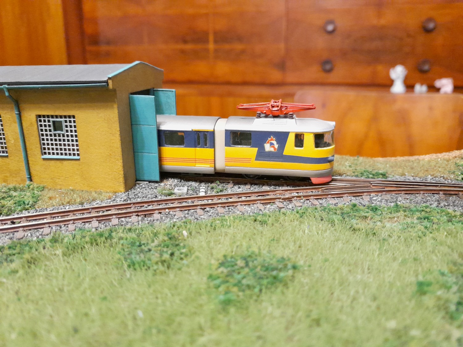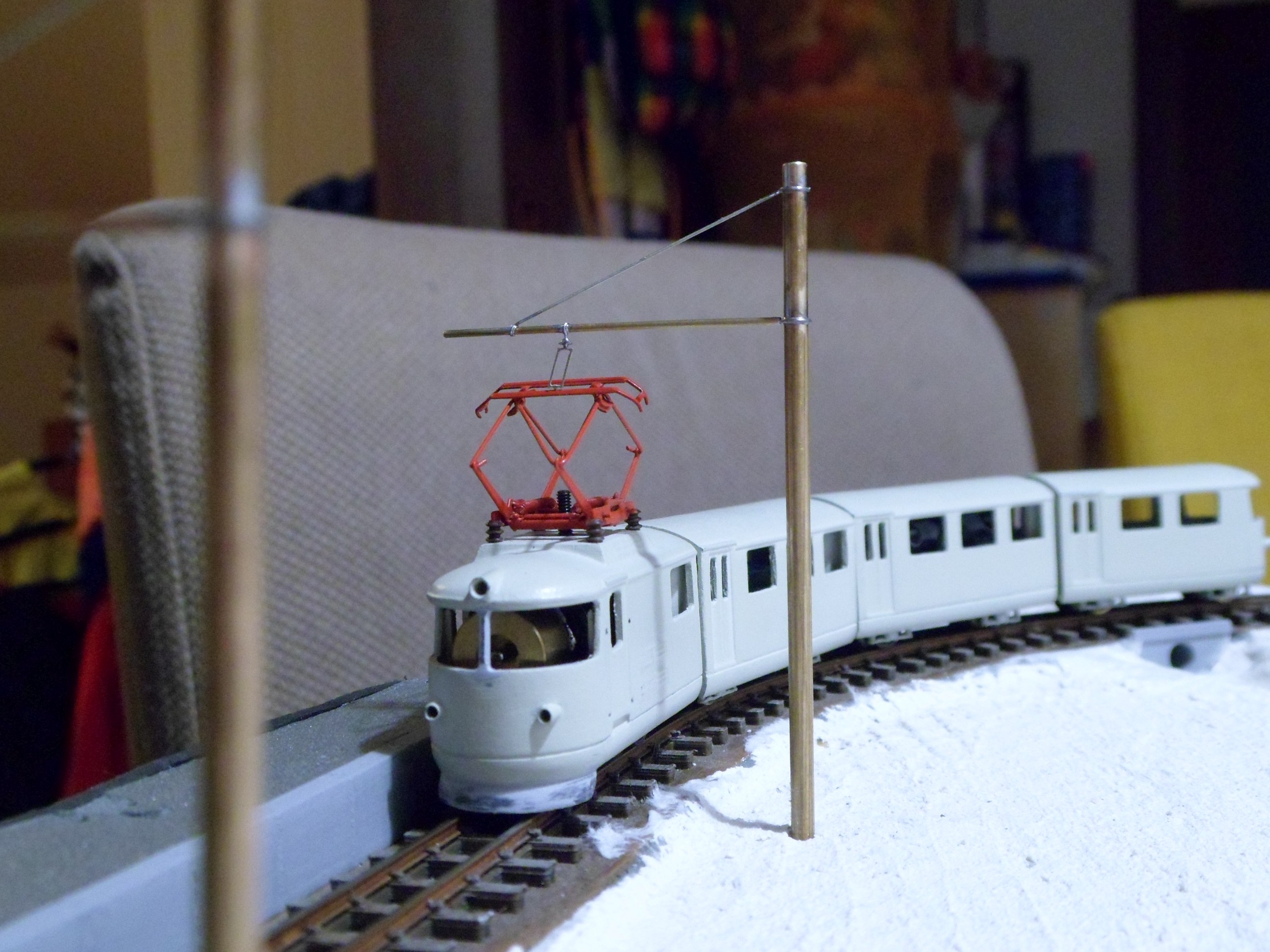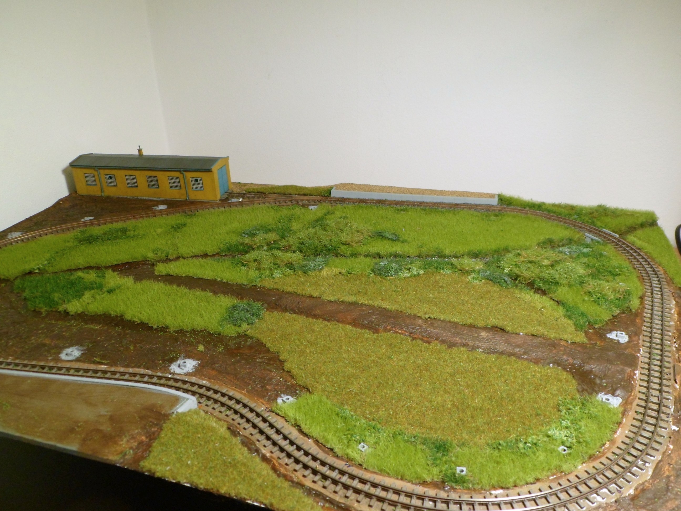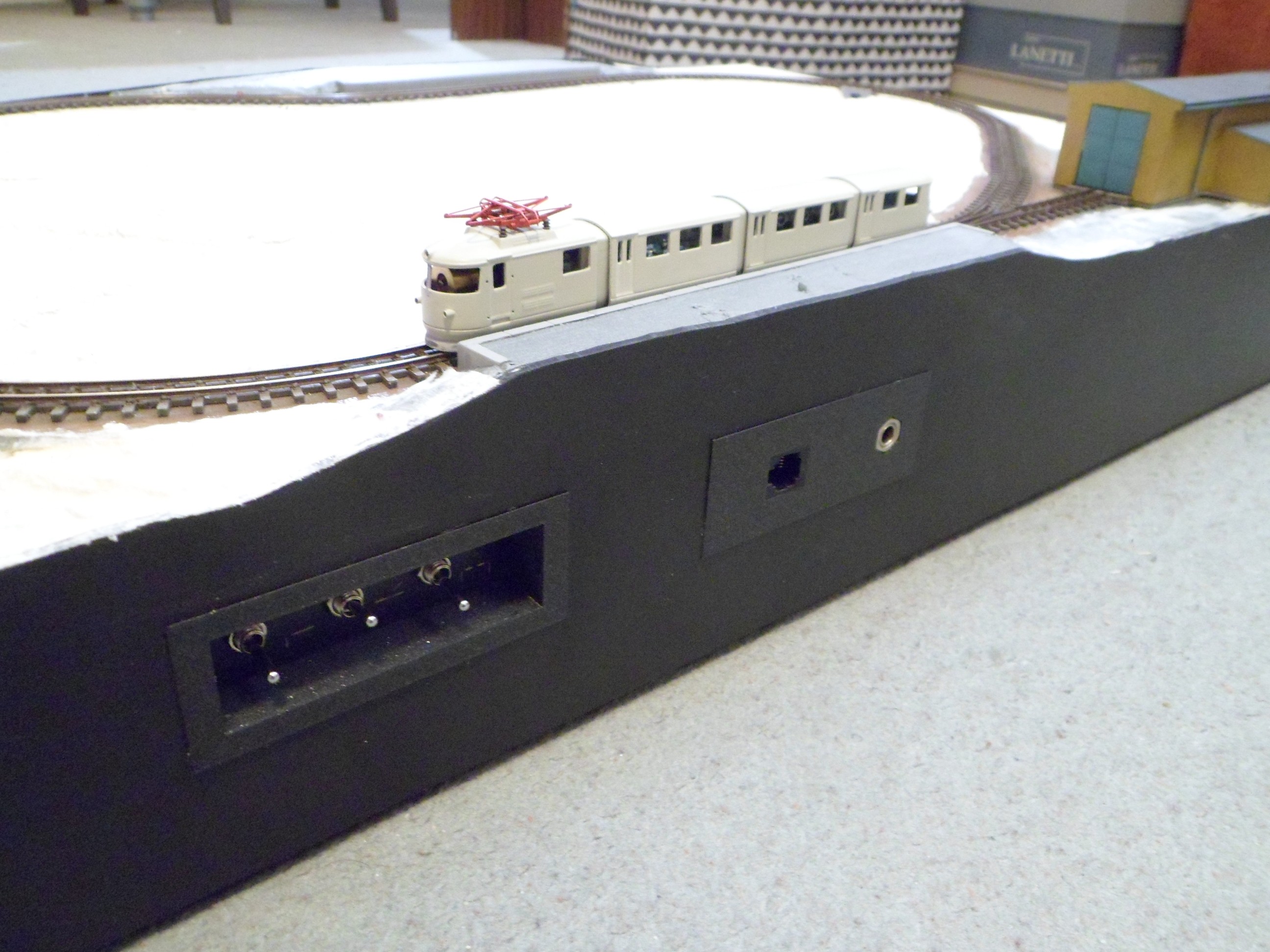Moc jsem od září nepokročil, resp to není moc vidět... Kolejiště je kompletně zapojené. Trakce i příslušenství jsou v DCC, sice se to zdá pro takové mini jako luxus, ale analog bych už nestavěl. Jednotka měla maximální rychlost 30km/h, to v kombinaci s mini provedením nutně znamená zpomalí v dekodéru. Kvůli jízdním odporům sbírám proud pouze ze dvou hnacích dvojkolí a zde velmi pomůže powerpack. Výhybka má izolovanou srdcovku a není problém s jízdou na minimální rychlosti. U příslušenství je zase výhoda ve snadném nastavení servopohonů. V kolejišti mám zabudovaný zesilovač ROCO 10761 a pro ovládání připojuji jako centrálu multimaus. Příslušenství ovládám přes TCO.