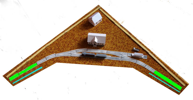 první část s viditelným koncovým nádražíčkem o rozměru 40 x 100 cm, viditelné nádraží je možno začít už výhybkou u kraje panelu čímž by se trochu zvětšila i užitná délka kolejí ... celkový potřebný prostor při rozložení by byl 140 x 80 cm nebo 180 x 80 cm