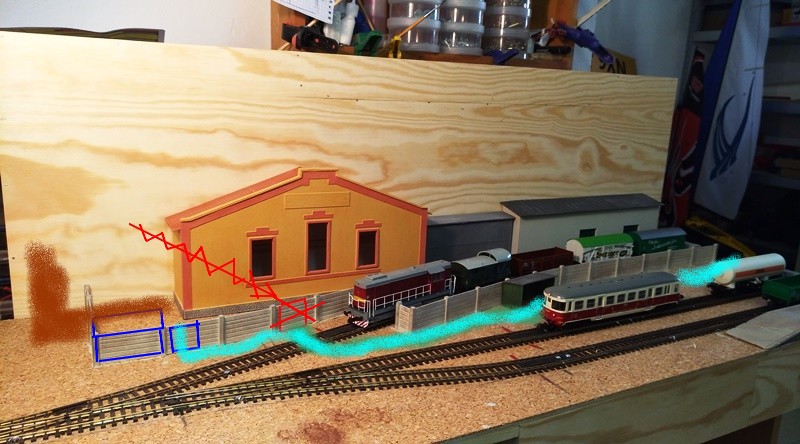 Taky bych se přikláněl k návrhu Myšpulína pro společnou vrátnici. Nejspíš bych ani nedělal nástupiště pro lidi ze strany od fabriky ale spíš z druhé, jakoby zepředu panelu. Od něj pak už může být vyšlapaná pěšina přes koleje, a třeba i kus podle zdi fabriky nejlépe ke společné vrátnici pro auta i pěší s naznačením silnice zleva odzadu. Stranu u plotu bych nechal trochu zarůst křovím, stranu vepředu upravil trochu do podoby nástupiště, asi by ani nebyla nutná nádražní budova jako taková, která by jen stínila výhledu na koleje. To by realitě minulého i současného režimu odpovídalo asi víc, protože pracující lid si cestu do práce vyšlape zkratkou i přes ty koleje, než aby to někam museli obcházet po silnici k přejezdu či mostu a po druhé straně kolejí zpět ...
