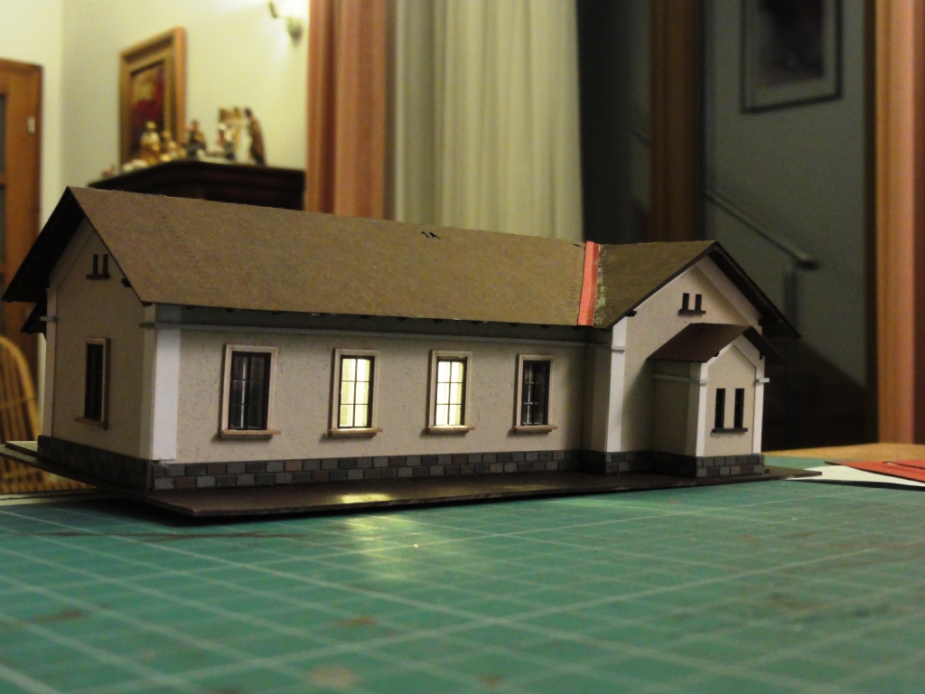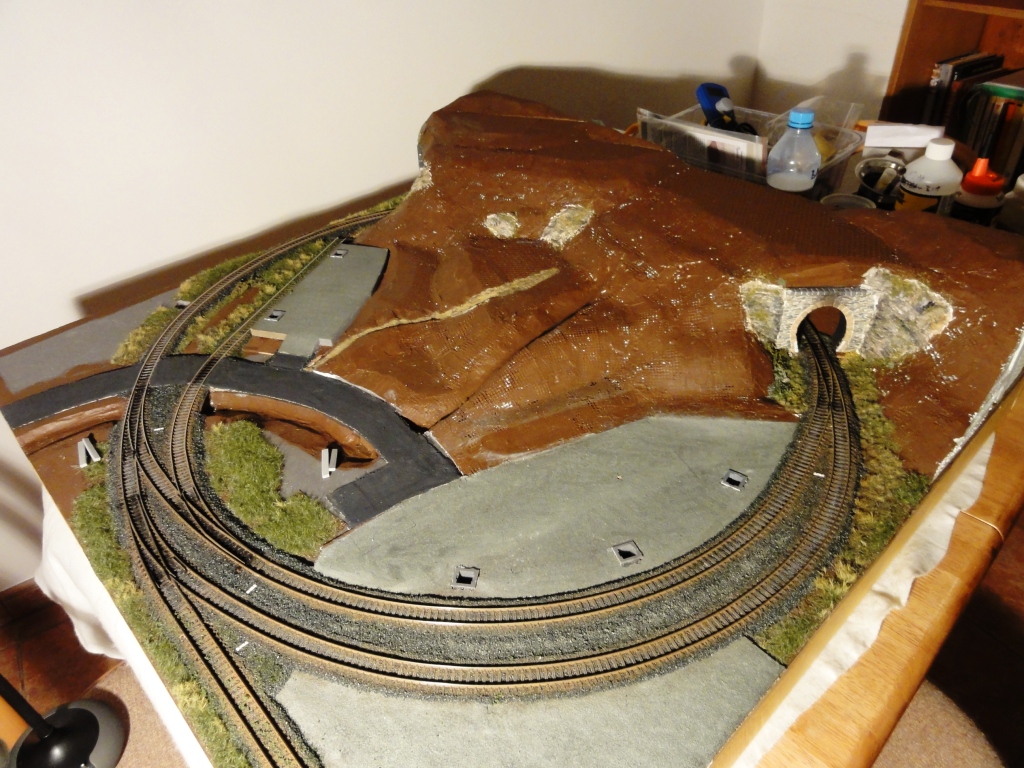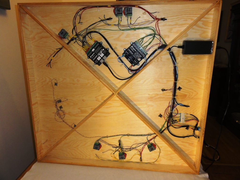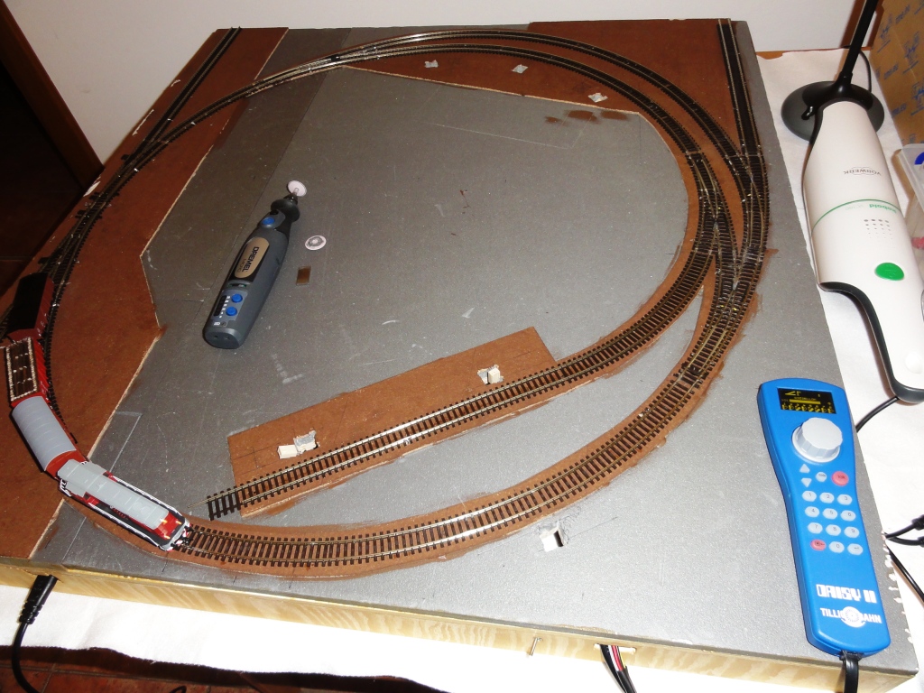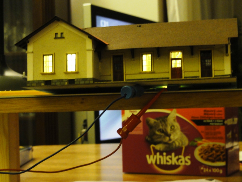 Napájecí zdroj +15V umístím trvale pod desku (viz nakreslený obdélníček). Ústředna se bude připojovat zvenčí pomocí konektoru CANON 15pin, na kterém bude napájení a zem, DCC, připojení programovací koleje a 4 vodiče pro S88. Programovací kolej bude vpravo dole (kusá u skladiště), napájení řešeno páčkovám přepínačem (DCC/prog). U tak malého kolejiště jsem uvažoval ponechat pro programování celé kolejiště, ale nakonec jsem od toho ustoupil. Výhodou připojení přes konektor je, že nebudu mít ústřednu "blokovanou" a můžu pro ruční provoz použít i ústřednu ze sady DAISY II případně jakoukoliv jinou.