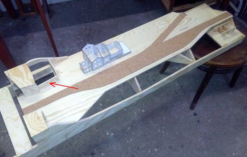 Vpravo je polotovar propustku. Ještě váhám jak upravit stěnu označenou šipkou. Nevím jestli bude hezčí opěrná zeď nebo skála. :roll: