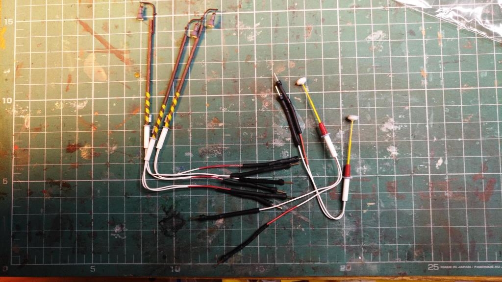 Za víkend jsem se aspoň dokopal k přípravě lamp. Po všech variantách zapojení a montáže jsem zůstal u připojení pomocí pinů ze zlacené kolíkové lišty. Do jednoho přívodu jsem připájel odpor, do druhého diodu. Přes to teplem smrštitelnou bužírku a hotovo. Pro lampy vrtám díru 3,5mm, kterou se dají jednotlivě piny protáhnout. Vůli pak vymezím namotáním kousku lepící pásky na spodní (bílou) část lampy. Protikus jsou zásuvky NS25, které přilepím do vhodného místa vespod desky poblíž lampy. Výhodou je snadná montáž, lampy lze celkem jednoduše demontovat. Naopak lze polaritu splést, nicméně díky diodě se nic nestane, jen holt lampa nesvítí...