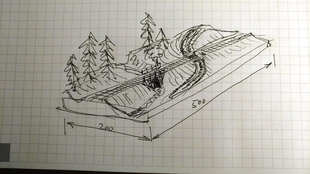 pustil jsem se do dioramatu "širá trať" po sté. Neumělý ideový náčtr je tady, velikost 20 x 50cm, měřítko TT.