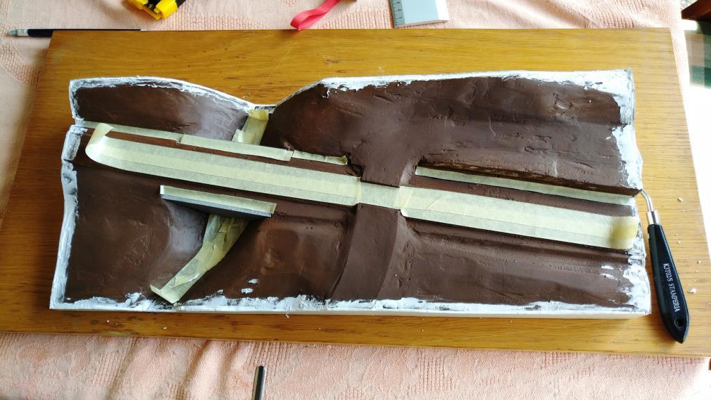 Šikmo vedená kolej lokálky, propustek s potokem a polní cesta s přejezdem. Obdivuji kolegy, kteří dokážou "spáchat" podobný projekt za víkend, já se tím zabývám už týden a mám hotový základ (zapomněl jsem na kulturní začištění boků, tak se po vybroušení tmelu bude ještě dobarvovat).