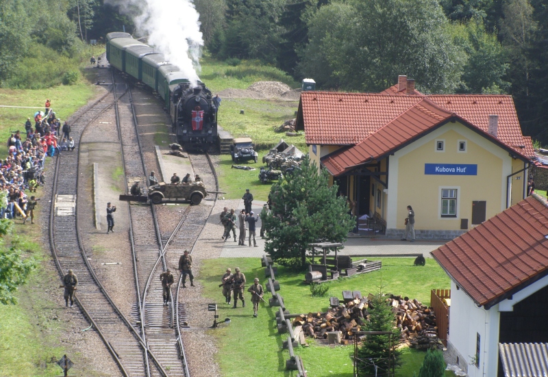 O pár kilometrů severněji na téže trati by bylo možná zjímavější nádraží. mám pocit že i nejvýše položené (990 m.n.m.), a takové správně mrňavé... Kubova Huť. Tam se směrem doleva kousek za nádražím trať zařezává do víc jak 5 metrů hlubokého zářezu, to by pro schování tratě bohatě stačilo, a na druhou stranu by se trať "utopila" v lese jen v obráceně stočeném oblouku...