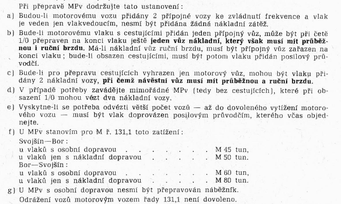 Trať Bor – Svojšín (tehdy se Svojšín ještě jmenoval Svojšín-Černošín) byla motorizována v roce 1934 prostřednictvím motorových vozů M 120.4, které ale nebyly použitelné pro nákladní dopravu, a tak se zátěže do Boru a Bělé nad Radbuzou vozily v parní trakci oklikou přes Tachov; zřejmě už tehdy vyhodnotili vedení nákladních vlaků v uvedeném úseku jako neekonomické. Když v prosinci 1948 výtopna Cheb dostala jako úplně první motorák této řady vůz M 131.156, dislokovala ho právě do Boru. Po úspěšném vyzkoušení s nákladními vlaky do Svojšína mu byla stanovena norma hmotnosti pro vlaky MPv bez cestujících ve směru do Boru 50 t a opačně 80 t, s cestujícími 45/60 t. Od února do prosince 1949 bylo MPv vlaky v uvedeném traťovém úseku odvezeno neskutečných 2137 nákladních vozů, tj. v průměru 6 vozů denně. A navíc v roce 1950 v pauzách mezi vlaky ve Svojšíně motorák odvážel vozy se zeminou vytěženou při výstavbě 6 km vzdálené výhybny Ošelín. Popsaný způsob organizace provozu přetrval až do r. 1964, kdy byly přepracovány oběhy a na trati byly nově zavedeny dva páry parních Pv vlaků.