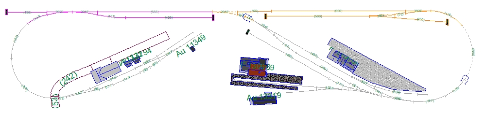 2. Provoz jen v pravé části - trochu limitní(provedením již hotového fialového SN), ale dá se jezdit tam a zpět s ruční přehozením mašin na soupravě, případně se dají využít krajní šturcy v SN pro druhé lokomotivy, dále možnost křižování v mezilehlé a posunu na vlečkách.