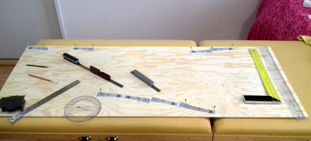 Nová pravá o stejné šíři, prodloužena na 130cm, opět se SN(oranžová za kulisou. Zde jsem čerpal zase z návrhů Milana minikolejišt, líbili se mi třebas Liščí,Stínky,Huntířov. Nakonec jsem se jen inspiroval a zvolil jsem dvoukolejnou mezilehlou staničku s napojením vlečkového "areálu". Předpokládám provoz krátkých souprav, dvousé vagony i u Os. Od budovy-dopravní kolej s krátkou kusou pro drobnou příležitostnou nakládku, druhá kol. manipulační a dlouhá kusá manipulační pro odstavení a obměnu vozů z vlečky. Rád bych někam ještě malou remízu, ale nějak není nápad kam? Propojení celků je ve SN pravou oranž. vyhýbkou, tím je z toho smyčka, té jsem se původně bránil, ale proč nakonec ne.